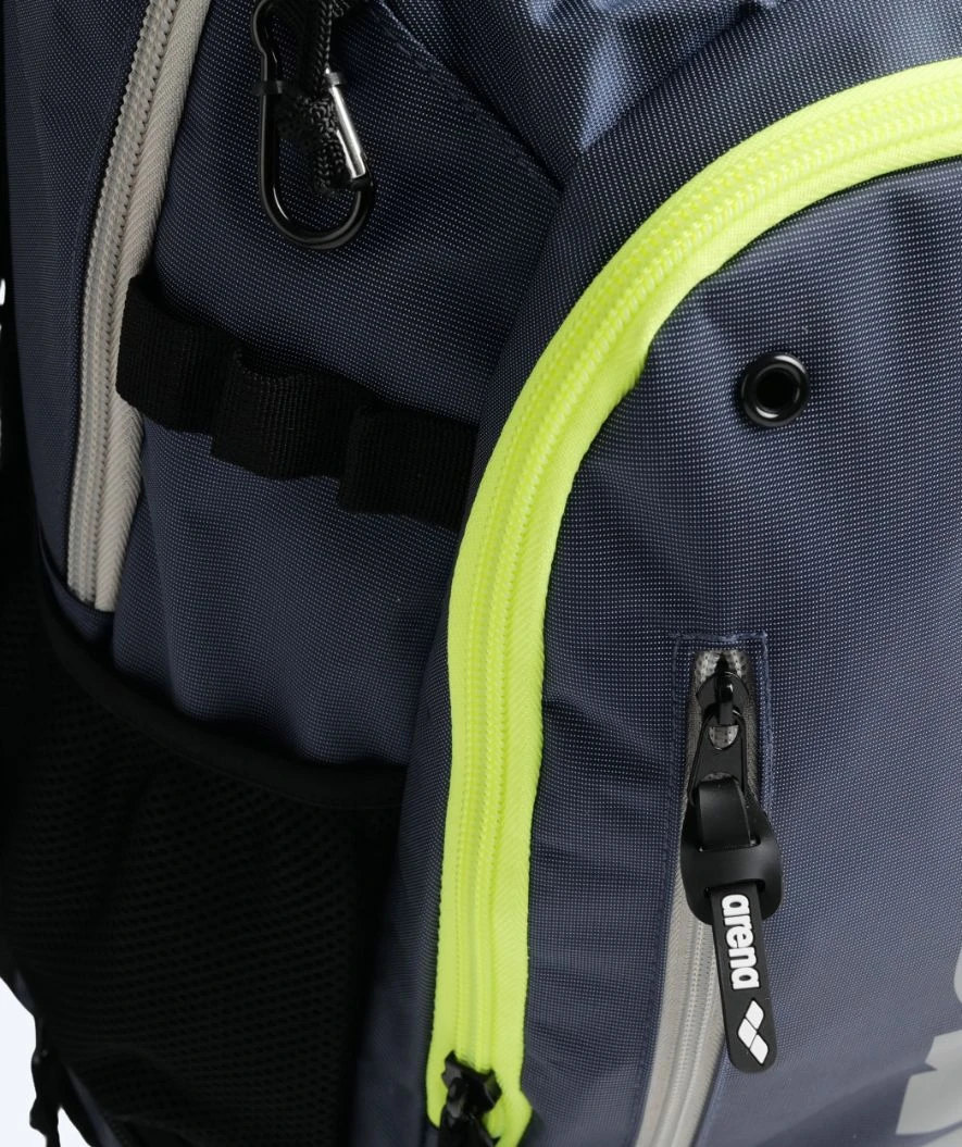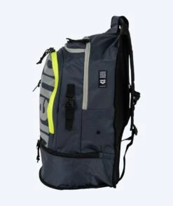 På utsiden av bagen er det en nettinglomme du kan ha drikkeflasken din i. På motsatt side er det et mindre rom der du eksempelvis kan ha mobil og lommebok. Foran får du plass til inneskoene dine i en nettinglomme. Her er det også to karabinkroker du eksempelvis kan henge vått tøy, svømmeføtter, etui til svømmebriller eller noe helt annet i.