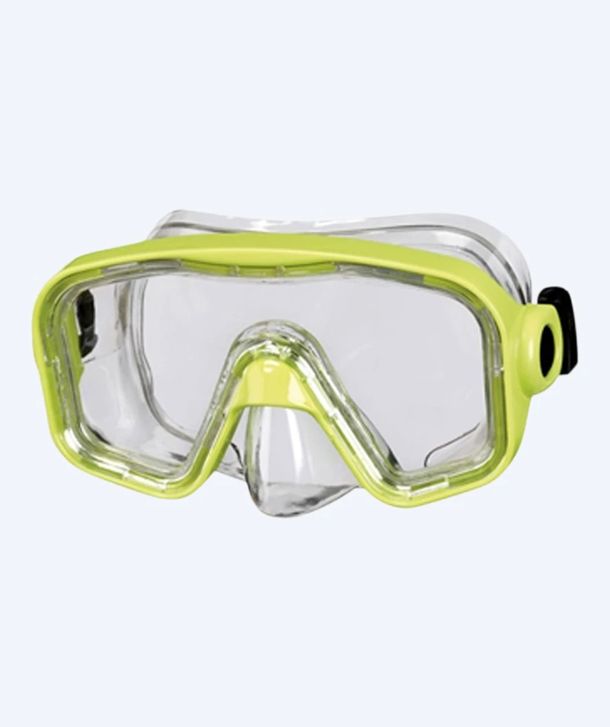 Denne dykkermasken har et gult design, men den er også tilgjengelig i fargene rød og blå. Modellen er også tilgjengelig som snorkelsett her.