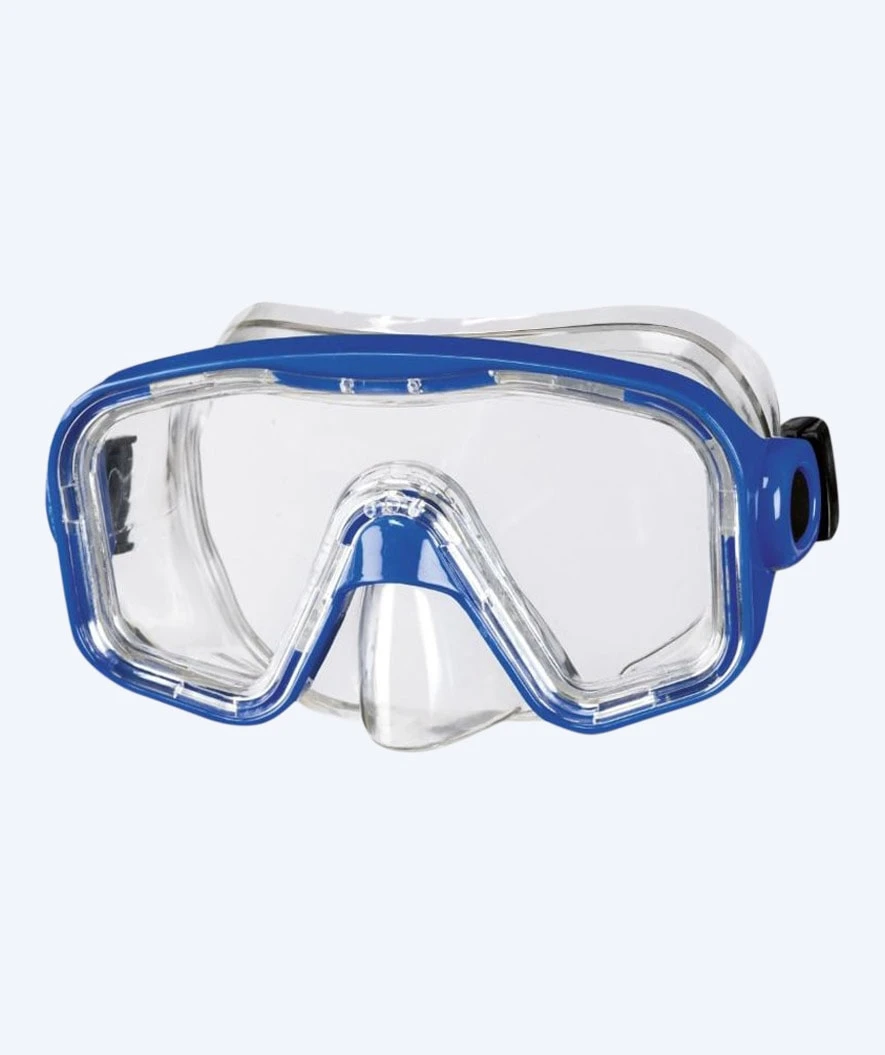 Denne dykkermasken har et mørkeblåt design, men den er også tilgjengelig i fargene rød og gul. Modellen er også tilgjengelig som snorkelsett her.