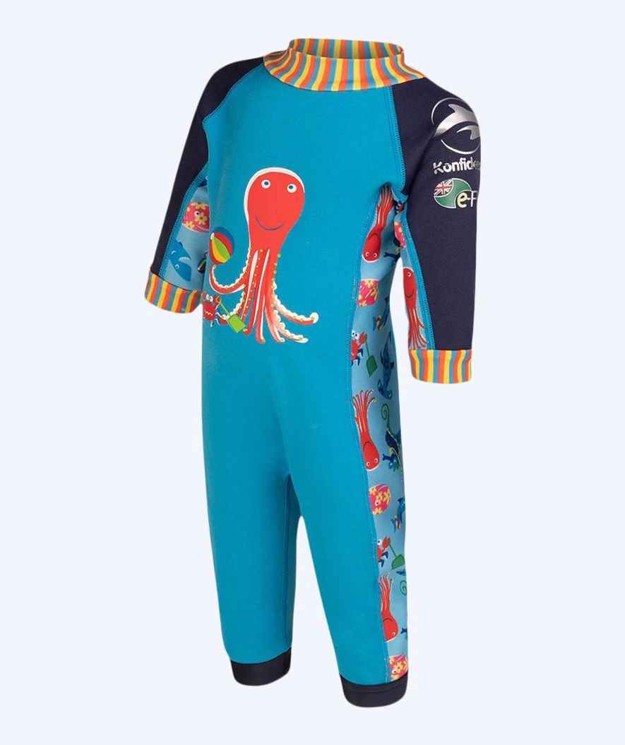 Svømmedrakten er laget i mykt og behagelig neoprene, som er et fleksibelt materiale, som også beskytter mot 100 % av solens UV-stråler, samtidig som at det holder barnet varmt, både i og utenfor vannet.