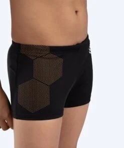 Disse korte badebuksene for gutter er produsert i vårt unike signatur materiale AquaFlex Eco som består av 100 % polyester (hvorav 55 % fra resirkulerte plastflasker) og er de eneste trunks badebuksene i bærekraftige materialer som også er ultra klorresistent (+500 timer) i vann.