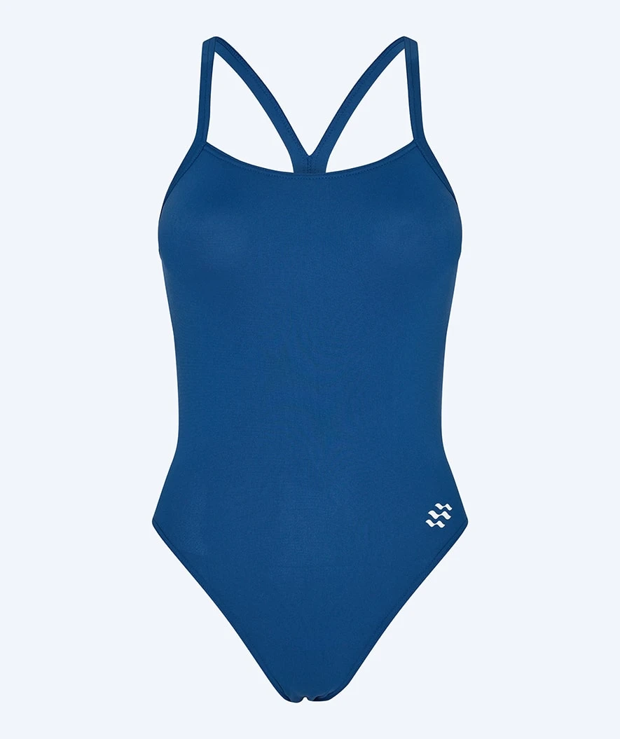 Freestyler Solid for damer i fargen mørkeblå er designet med et enkeltlags stoff, åpen rygg, høyt bensnitt, rene farger og en diskret hvit Watery-logo nederst på hoften. Totalt sett sørger den for en ekstremt sporty og feminin look, i tillegg til en slank silhuett.
