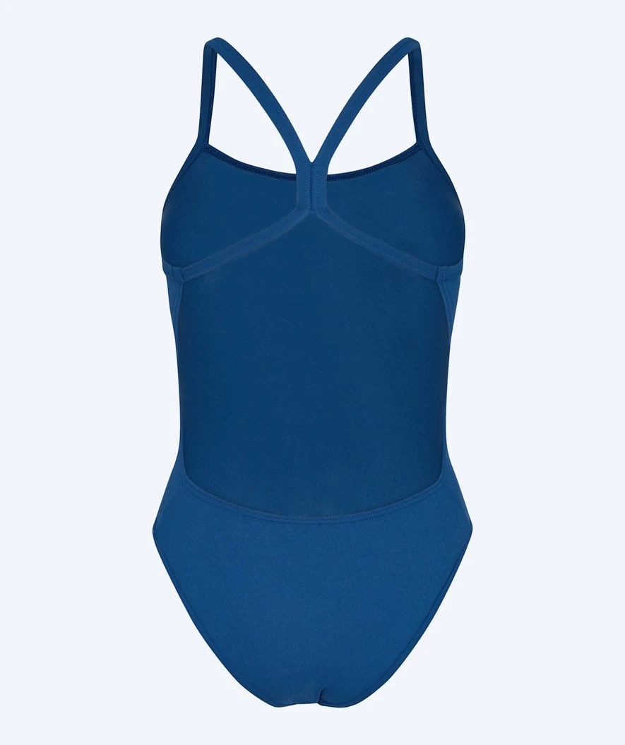 Freestyler Solid badedrakt for damer/jenter i alderen +13 år har raskt blitt vår klare toppselger og en favoritt blant svømmere uansett nivå. Badedrakten er designet med høyt bensnitt, tynne stropper, fri rygg og laget i vårt svært slitesterke og klorresistente materiale AquaFlex – optimalt for deg som bruker mange timer på banesvømming, er glad i være i svømmebassenget og/eller på stranden og ønsker å leve mer bærekraftig. Her i fargen mørkeblå.