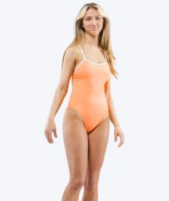 Watery Swim Rider, her i fargen Coral, er designet med et enkeltlag stoff, åpen 2-delt rygg med samling under kragebeinet, høyt bensnitt, hvite stropper i kontrast til bunnfargen og en diskret hvit Watery-logo nederst på hoften. Totalt sett får du en ekstremt sporty og feminin look, i tillegg til en slank silhuett.