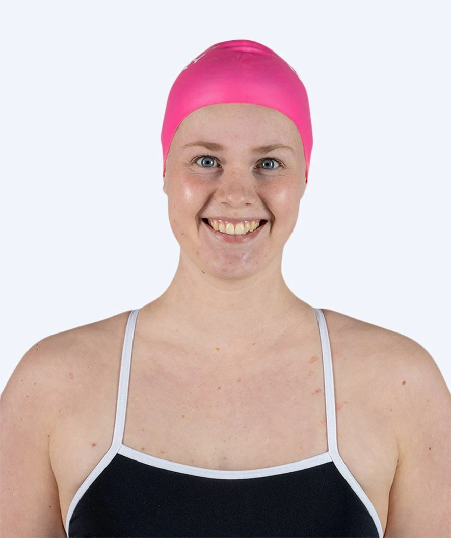 I tillegg til denne modellen i klassisk rosa med hvit logo, er badehetten også tilgjengelig i hvit, svart og blå.