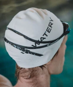 Watery-trykket på begge sider av badehetten er laget av blank keramisk blekk som skaper en effekt av at Watery-logoen stikker ut fra badehetten og gir den en eksklusiv finish.