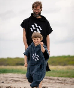Watery Poncho i bomull for junior dekker hele kroppen til barn mellom 6 og 15 år, så snart den tres over hodet. Barnet ditt vil derfor bli varmt med det samme og bli tørr over hele kroppen med den myke bomullens spesielle sugeevne, samtidig som han/hun vil være fullstendig beskyttet mot sol, vind og regn. Dere kan du gå opp til bilen i fred og ro uten å fryse – og uten å risikere at den faller av (som med et håndkle).
