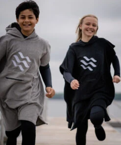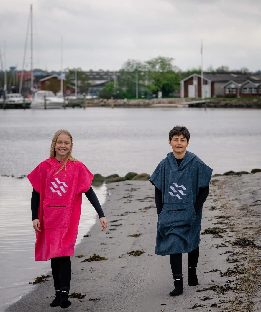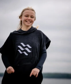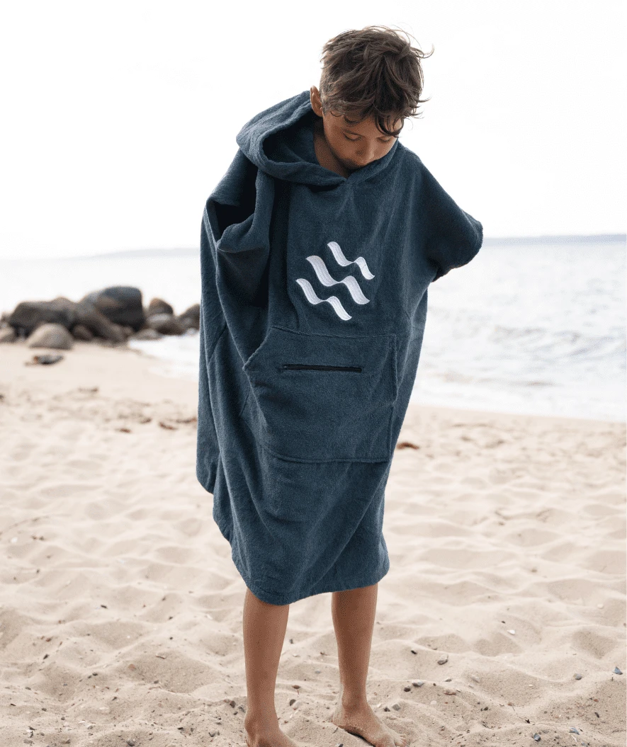 Watery Poncho i bomull for junior dekker hele kroppen til barn mellom 6 og 15 år, så snart den tres over hodet. Barnet ditt vil derfor bli varmt med det samme og bli tørr over hele kroppen med den myke bomullens spesielle sugeevne, samtidig som han/hun vil være fullstendig beskyttet mot sol, vind og regn. Dere kan du gå opp til bilen i fred og ro uten å fryse – og uten å risikere at den faller av (som med et håndkle).