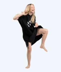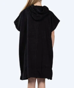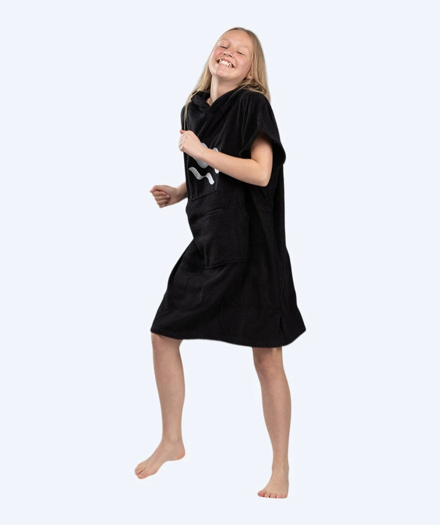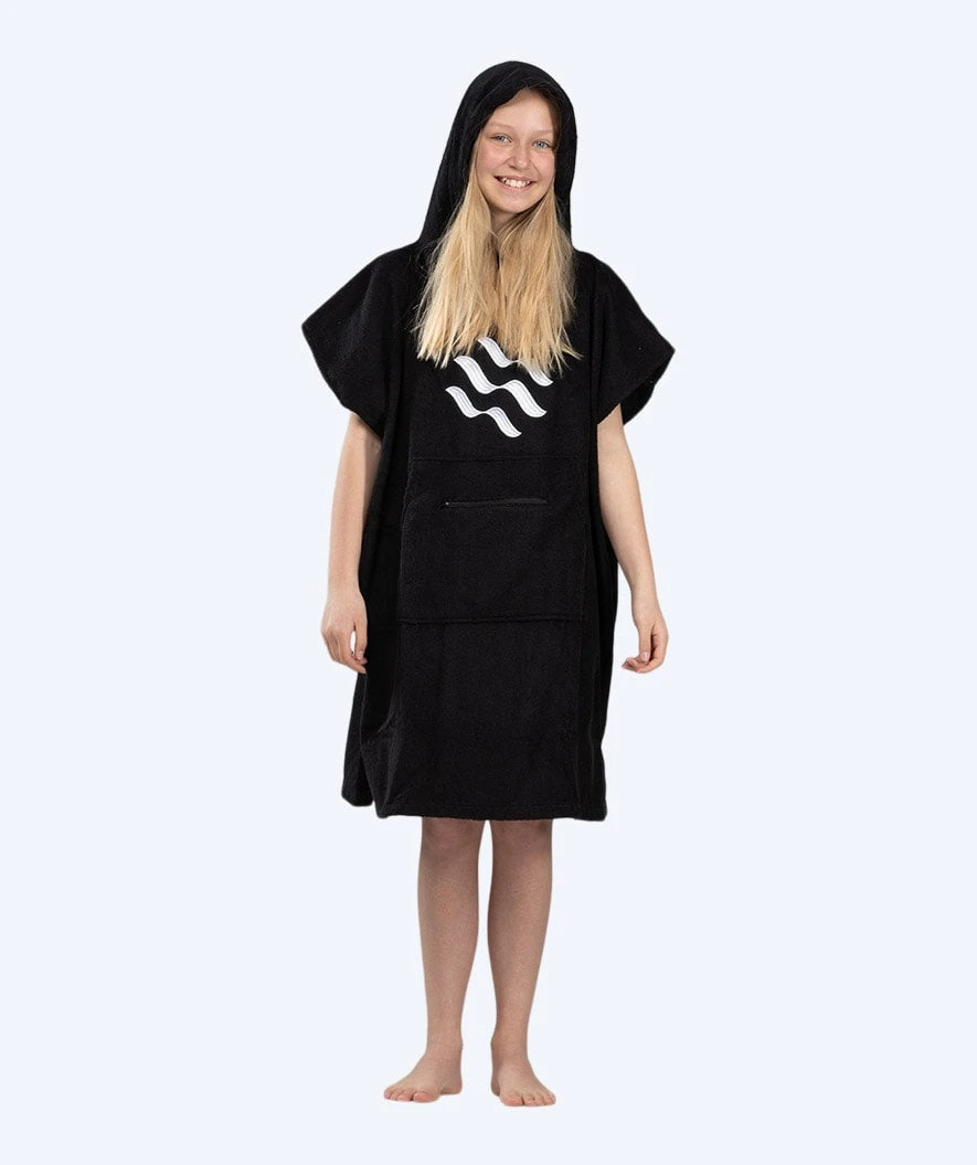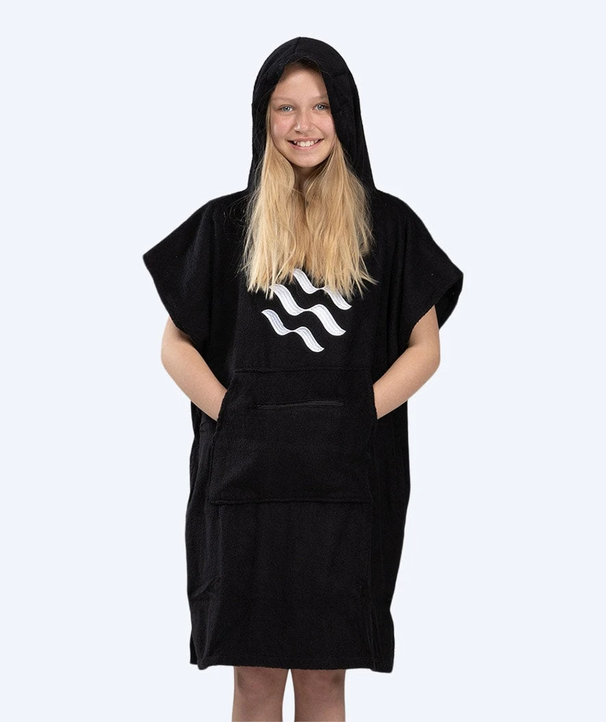 Sørg for at din datter/sønn på 6-15 år får varmen i seg straks etter svømmeturen/badet, og bytt enkelt og diskret til/fra badetøy med vår poncho i bomull for junior. Ponchoen er laget av særdeles myk 100% langhåret bomull og kan sammen med svært god evne til å absorbere vann, skilte med flere herlige fordeler som inkluderer vanntett kengurulomme foran for mobiltelefon/lommebok, oversized hette for beskyttelse mot regn og vind, store ermehull og åpning nederst for enkelt klesbytte under ponchoen. Ponchoen passer for jenter og gutter mellom 6 og 15 år. Her i den klassiske fargen sort.