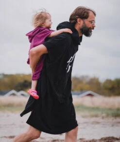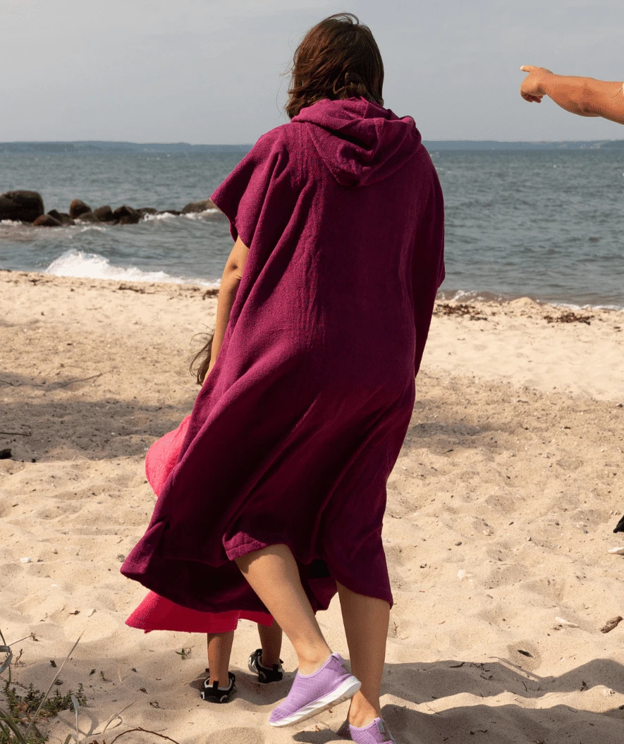Watery Poncho i bomull for voksne dekker hele kroppen så snart den tres over hodet. Du blir derfor varm med det samme og tørr over hele kroppen med den myke bomullens spesielle sugeevne, samtidig som du vil være fullstendig beskyttet mot sol, vind og regn. Du kan gå opp til bilen i fred og ro uten å fryse – og uten å risikere at den faller av (som med et håndkle).