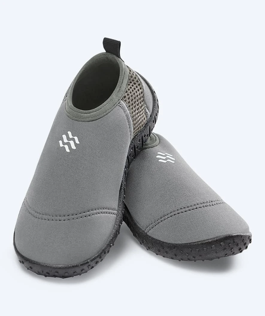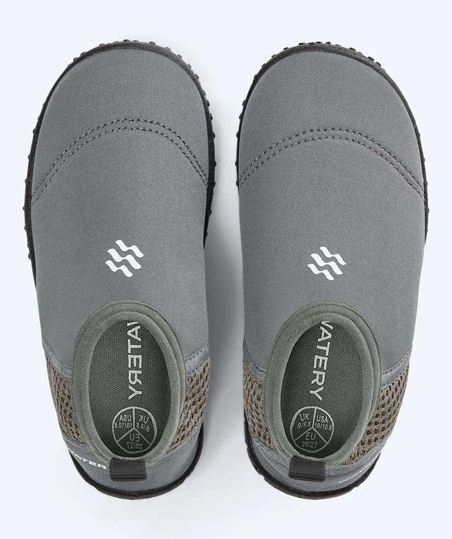 Watery High Catfish badesko til barn finnes i 4 friske farger, her i fargen grå. Den finnes også i fargene rosa, sort og mørkeblå. Det er en meget lett badesko, som barnet nærmest ikke merker at han/hun har på foten. Med denne badeskoen kan barnet ditt løpe fritt omkring, utforske sin nysgjerrighet og ha en skjønn dag ved stranden, ved bassenget, i svømmehallen eller hvor enn barnet ditt ellers ferdes.