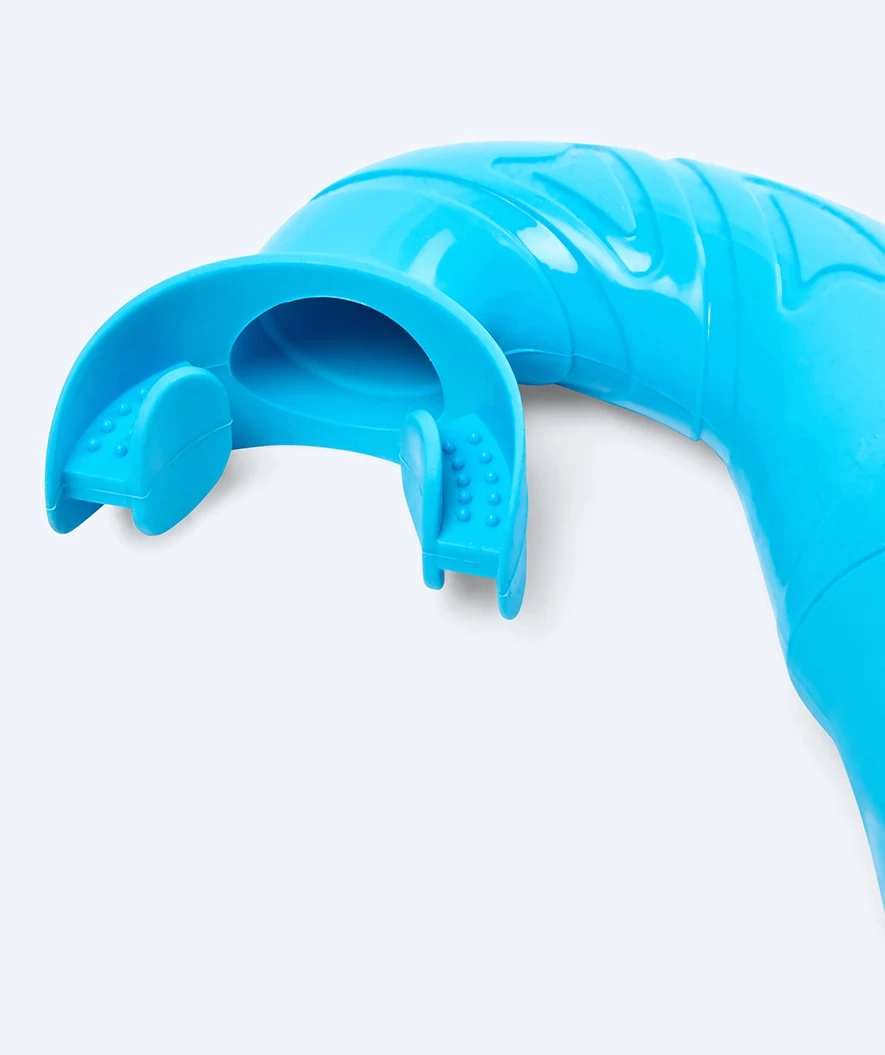 - Munnstykket er laget i silikon av høy kvalitet med et behagelig bitt tilpasset spesielt til barn mellom 9 og 16 år. Dette munnstykket kan til og med roteres, mens det sitter på, slik at snorkelen alltid sitter riktig. Det kan derfor også tas helt av og enten skiftes ut eller bare rengjøres, og deretter settes på igjen. Sammen sikrer dette at den samme snorkelen kan brukes gjennom flere år – uten at den må skiftes ut. Munnstykket er selvfølgelig fødevaregodkjent.