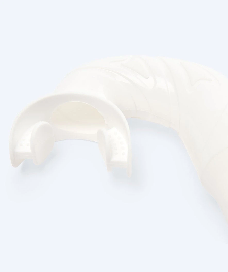 - Munnstykket er laget i silikon av høy kvalitet med et behagelig bitt tilpasset spesielt til voksne (+16 år). Dette munnstykket kan til og med roteres, mens det sitter på, slik at snorkelen alltid sitter riktig. Det kan derfor også tas helt av og enten skiftes ut eller bare rengjøres, og deretter settes på igjen. Sammen sikrer dette at den samme snorkelen kan brukes gjennom flere år – uten at den må skiftes ut. Munnstykket er selvfølgelig fødevaregodkjent.