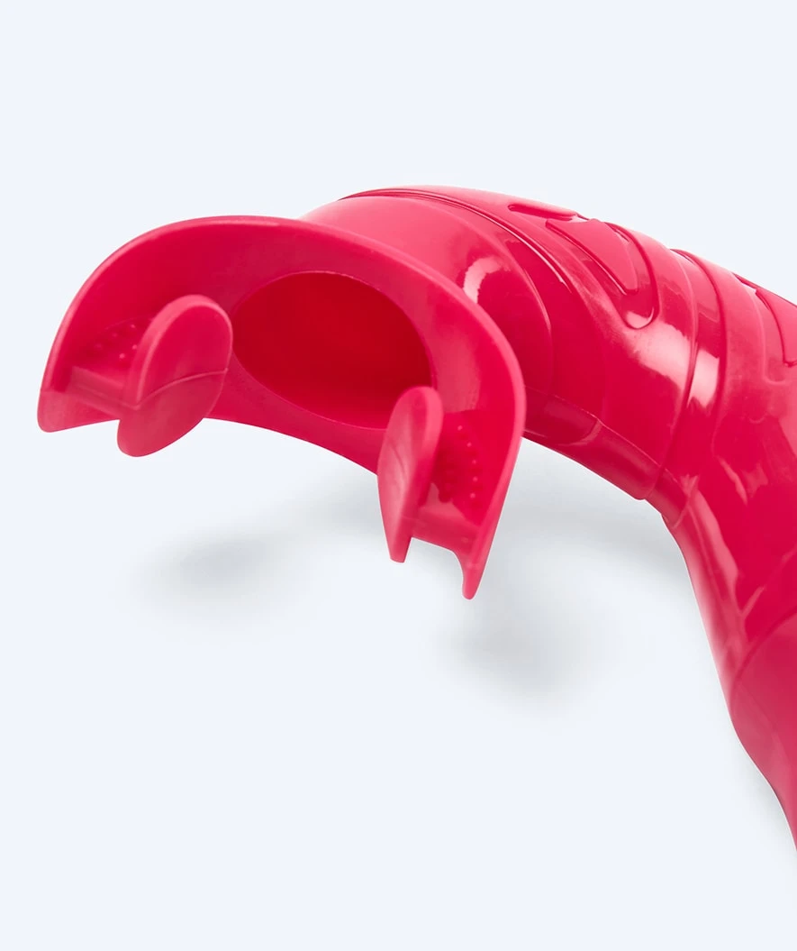 - Munnstykket er laget i silikon av høy kvalitet med et behagelig bitt tilpasset spesielt til voksne (+16 år). Dette munnstykket kan til og med roteres, mens det sitter på, slik at snorkelen alltid sitter riktig. Det kan derfor også tas helt av og enten skiftes ut eller bare rengjøres, og deretter settes på igjen. Sammen sikrer dette at den samme snorkelen kan brukes gjennom flere år – uten at den må skiftes ut. Munnstykket er selvfølgelig fødevaregodkjent.