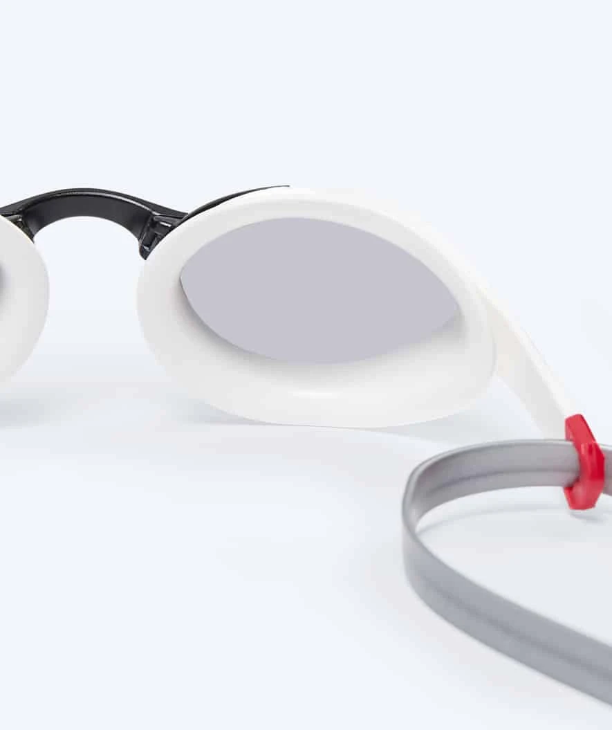 Med forlengede armpits på begge sider, som sørger for unik stabilitet i brillen og en ultra lavprofil ramme, er Murphy Mirror en av våre absolutte toppmodeller for konkurranse og svømmetrening for barn (fra 12 år) og voksne. I tillegg er linsen utstyrt med antidugg-behandling, et UV-beskyttende belegg og en komfortabel dobbel-stropp.