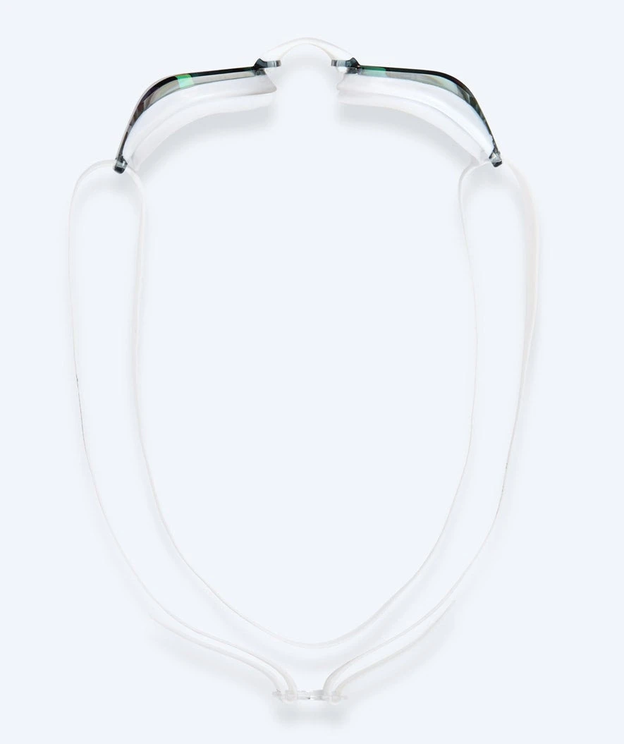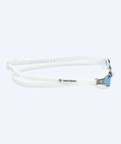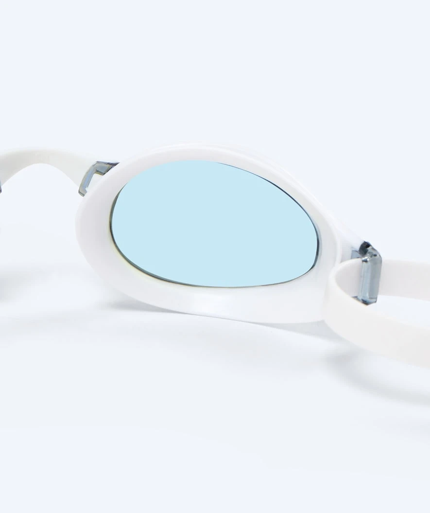 Designet med en ultra-lav profil med myke silikon øyekopper og et stort 180 graders utsyn fra de kurvede linsene. Vår Poseidon Mirror er for konkurranse- og mosjonssvømmere, som vektlegger redusering av vannmotstand, komfort og et bredt utsyn. Her i en hvit farge med blå mirror glass.