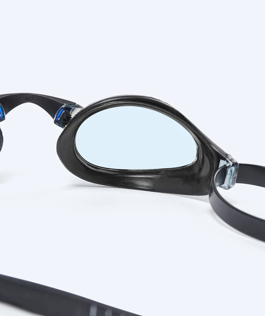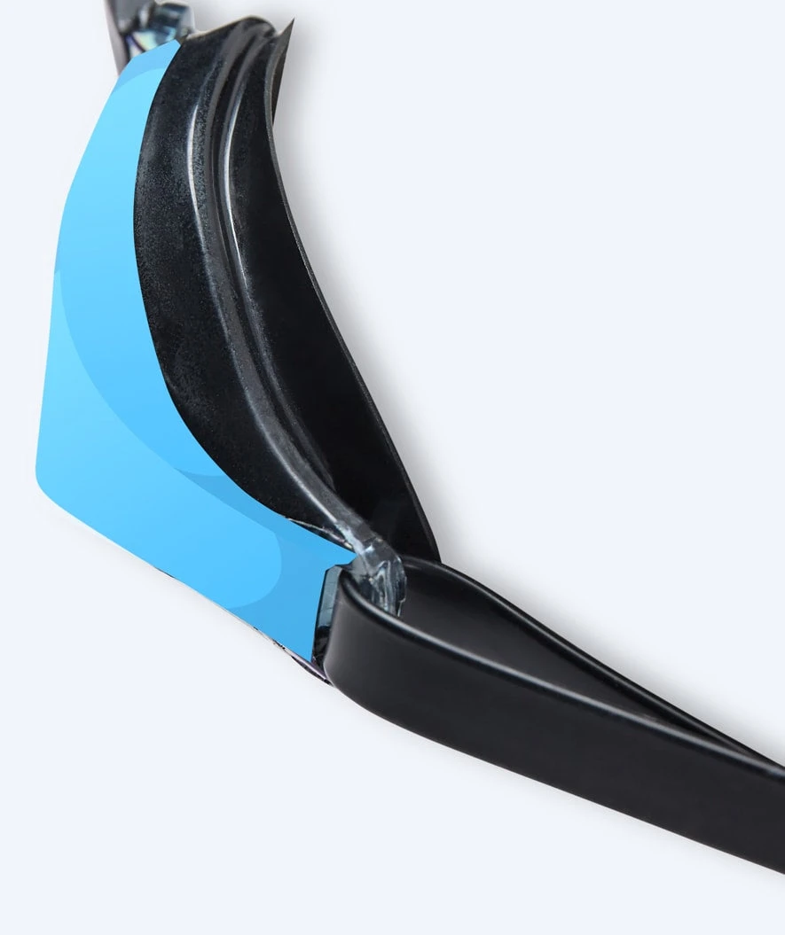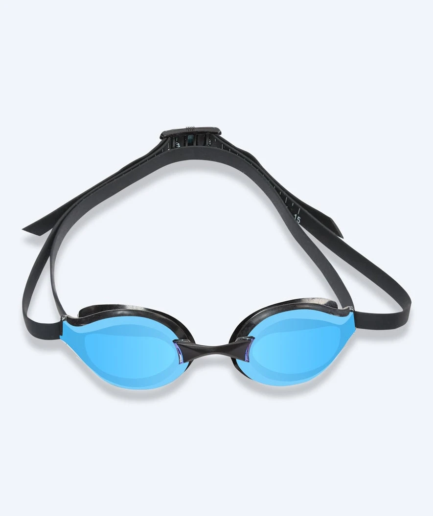 Designet med en ultra-lav profil med myke silikon øyekopper og et stort 180 graders utsyn fra de kurvede linsene. Vår Poseidon Mirror er for konkurranse- og mosjonssvømmere, som vektlegger redusering av vannmotstand, komfort og et bredt utsyn. Her i en sort farge med blå mirror glass.