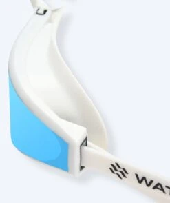 Watery Storm Racer Mirror er utviklet spesifikt til konkurranse og trenings svømmere, som har bruk for lavest mulig vannmotstand, en lav-profils passform og kurvede linser for et stort utsyn. Her i vår hvite modell med blå mirror.