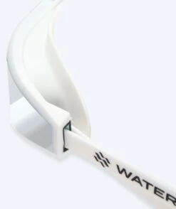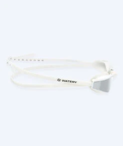 Watery Storm Racer Mirror er utviklet spesifikt til konkurranse og trenings svømmere, som har bruk for lavest mulig vannmotstand, en lav-profils passform og kurvede linser for et stort utsyn. Her i vår hvite modell med sølv mirror.