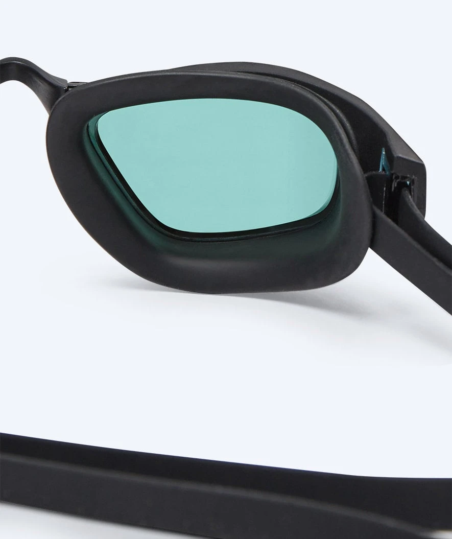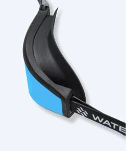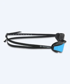 Watery Storm Racer Mirror er utviklet spesifikt til konkurranse og trenings svømmere, som har bruk for lavest mulig vannmotstand, en lav-profils passform og kurvede linser for et stort utsyn. Her i vår sorte modell med blå mirror.