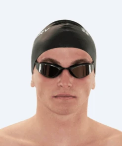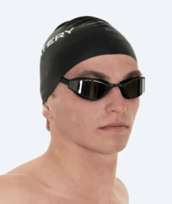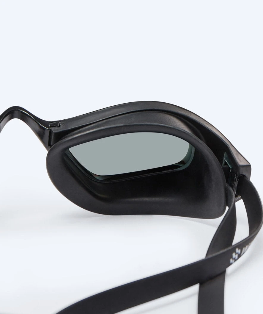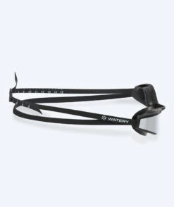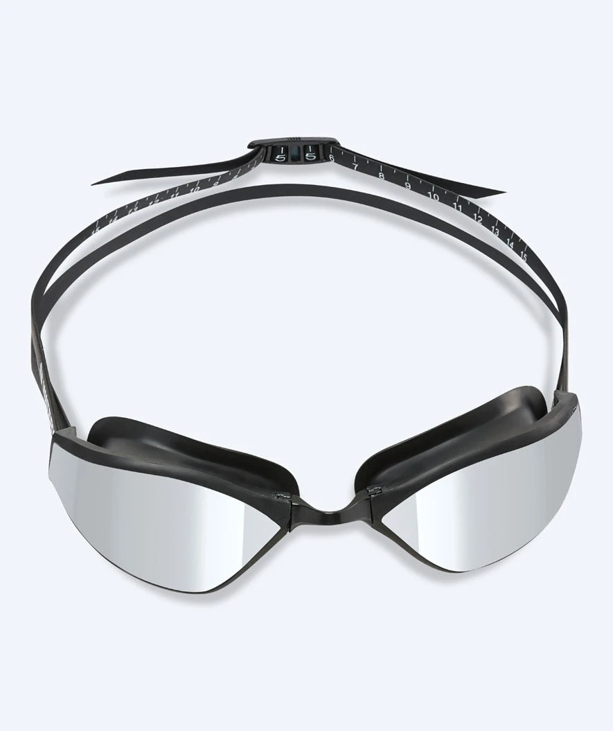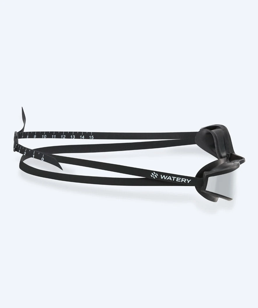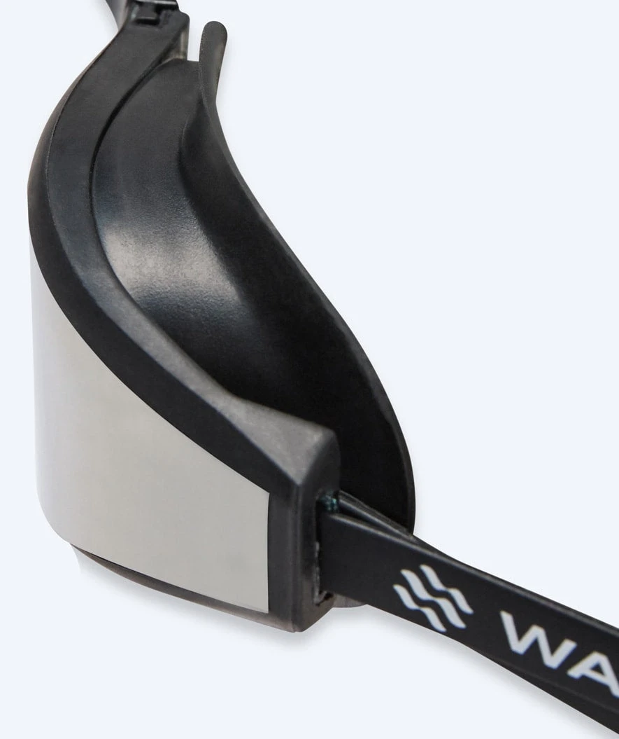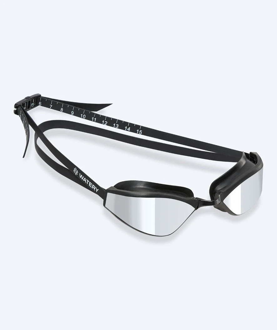 Watery Storm Racer Mirror er utviklet spesifikt til konkurranse og trenings svømmere, som har bruk for lavest mulig vannmotstand, en lav-profils passform og kurvede linser for et stort utsyn. Her i vår svarte modell med sølv mirror.