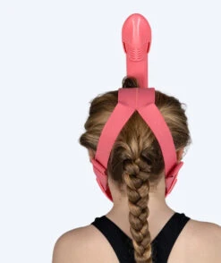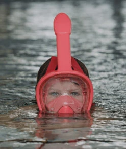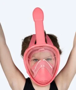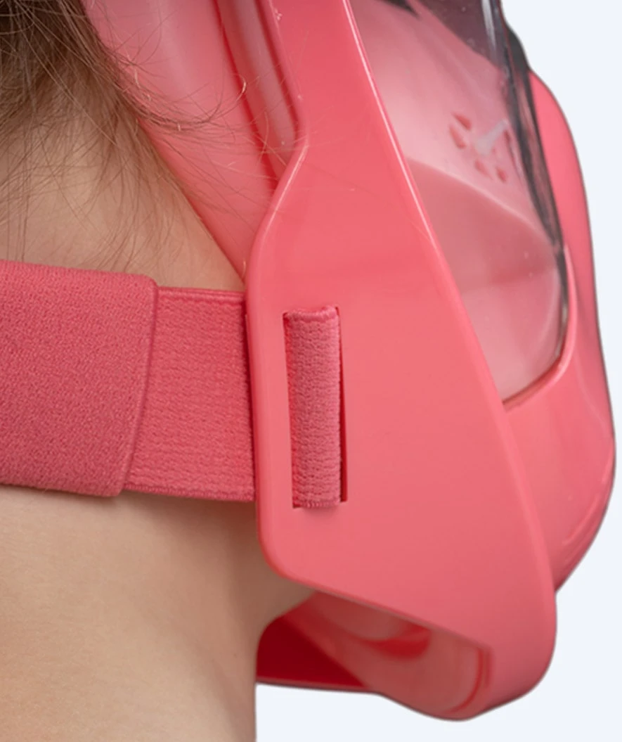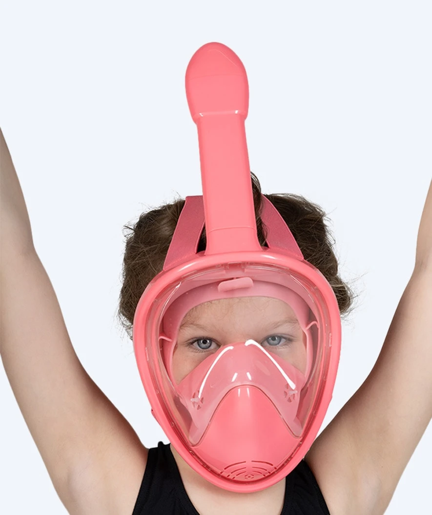 Watery Full Face maske vises her i rosa modell, men er også tilgjengelig i blå og svart. Den er også tilgjengelig for voksne.