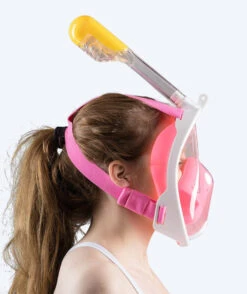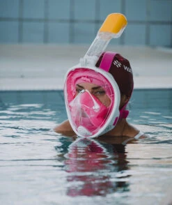 Watery Full Face maske vises her i rosa modell, men er også tilgjengelig i svart og blå. Den er også tilgjengelig for barn.