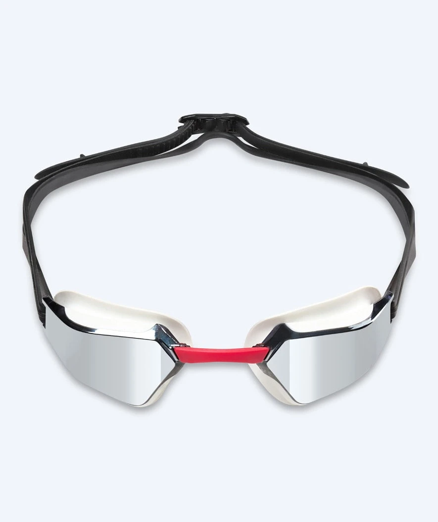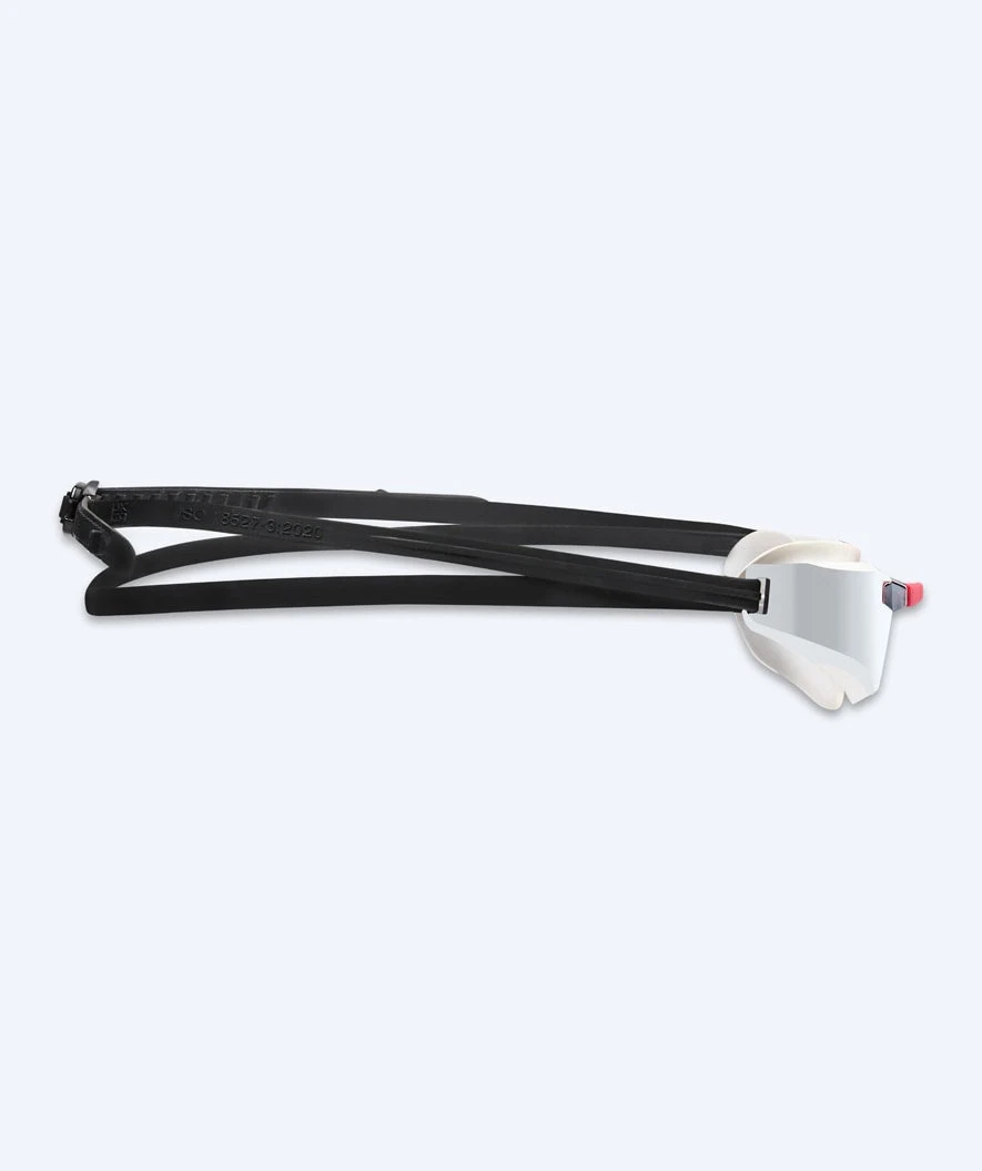 Topp svømmebriller for konkurranse og trening som raskt er blitt en av våre mest populære svømmebriller for både fritids- og elitesvømmere som verdsetter minimal vannmotstand, god sikt og en behagelig lavprofil passform rundt øynene. Her i hvit modell med sølv mirror.