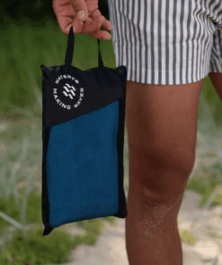 Håndkleet er 180 x 200 cm stort, litt større enn to sammenlagte vanlige håndklær, men tar mindre plass enn en drikkeflaske i den medfølgende gjenbrukbare nettingposen. Du kan derfor lett ta med deg håndkleet i badebagen eller kofferten.