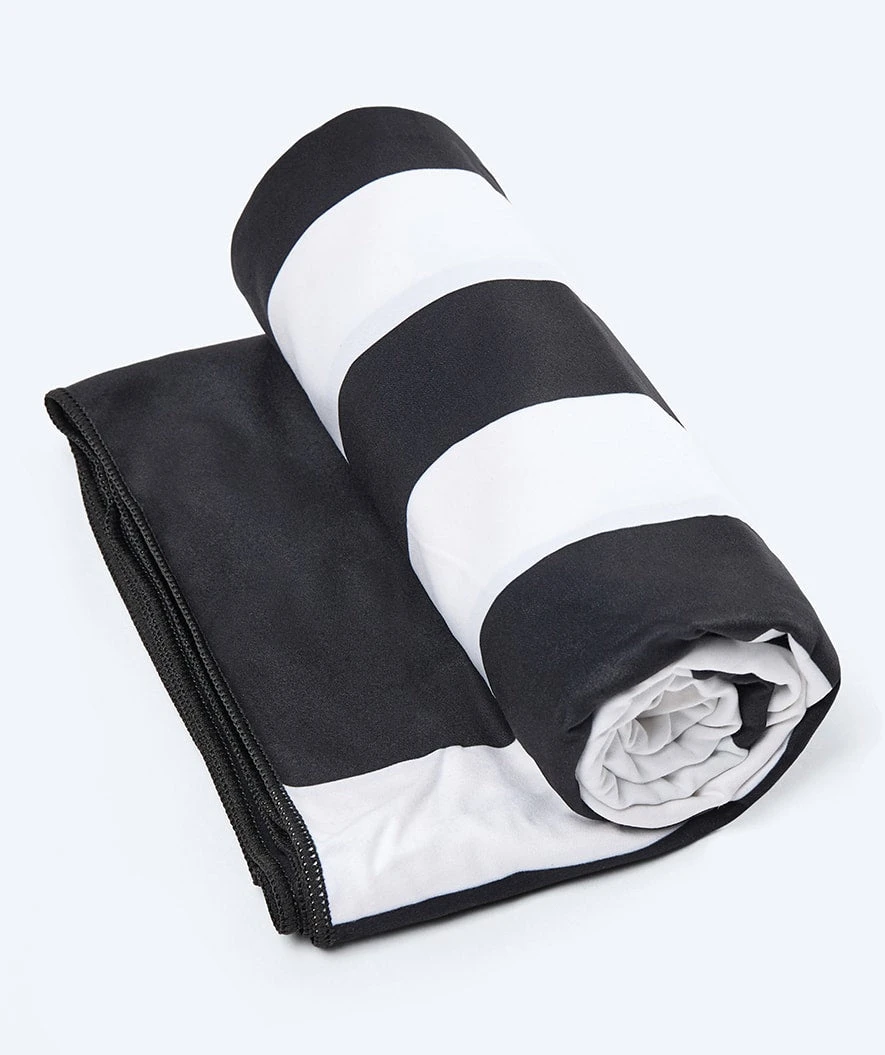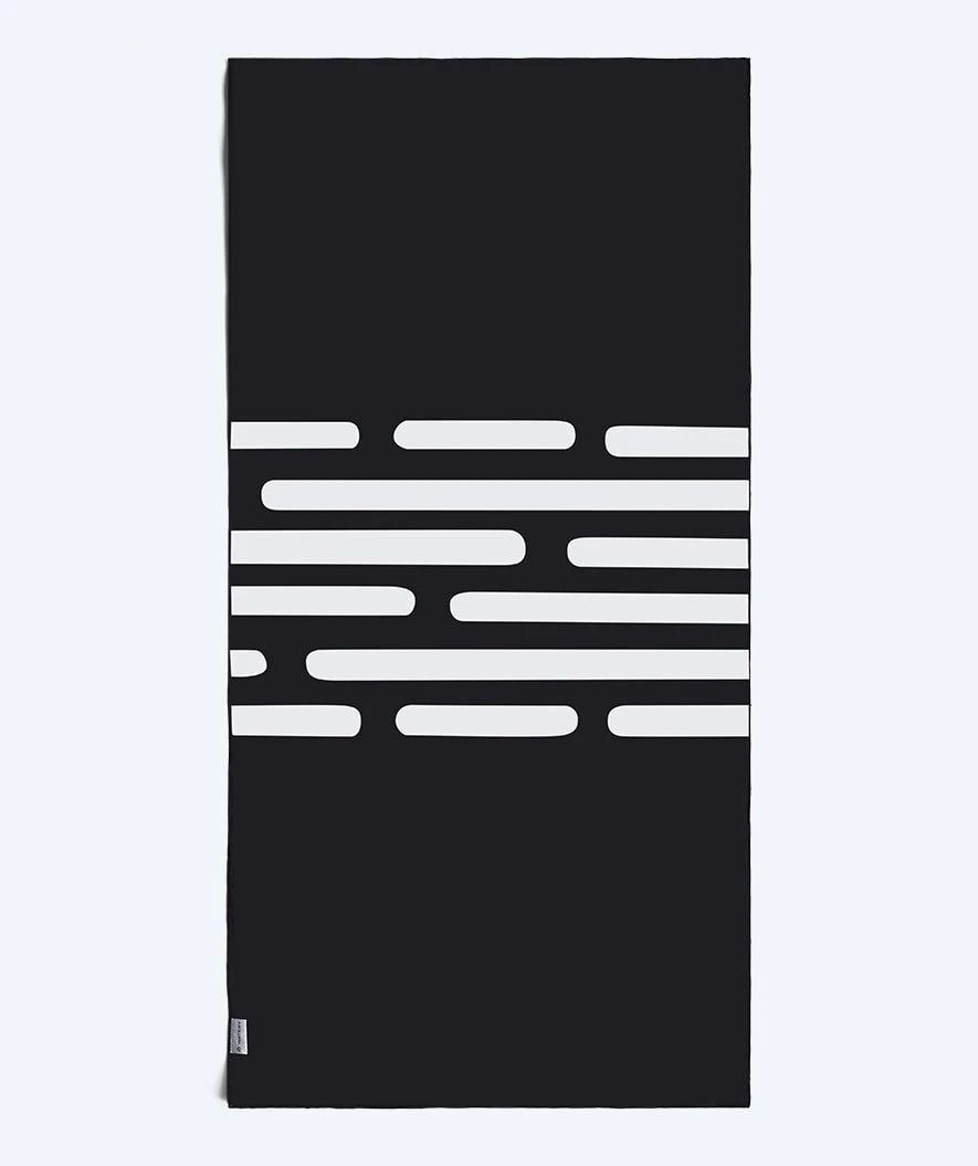 Det stilrene designet med to hvite streker på hver ende av håndkleet bringer tankene til sommer og sol og understreker vårt nordiske opphav. Her i fargen sort, men det er også tilgjengelig i fargene: Sandfarget, lilla, mørkeblå og blå.