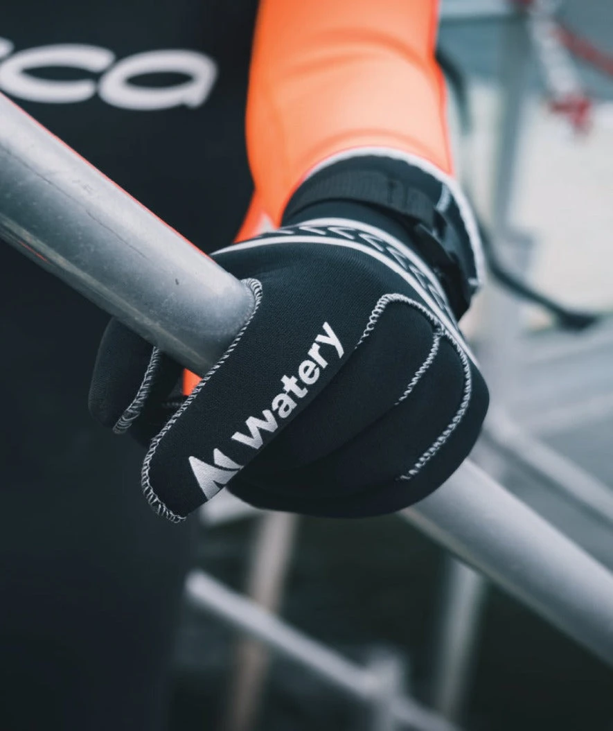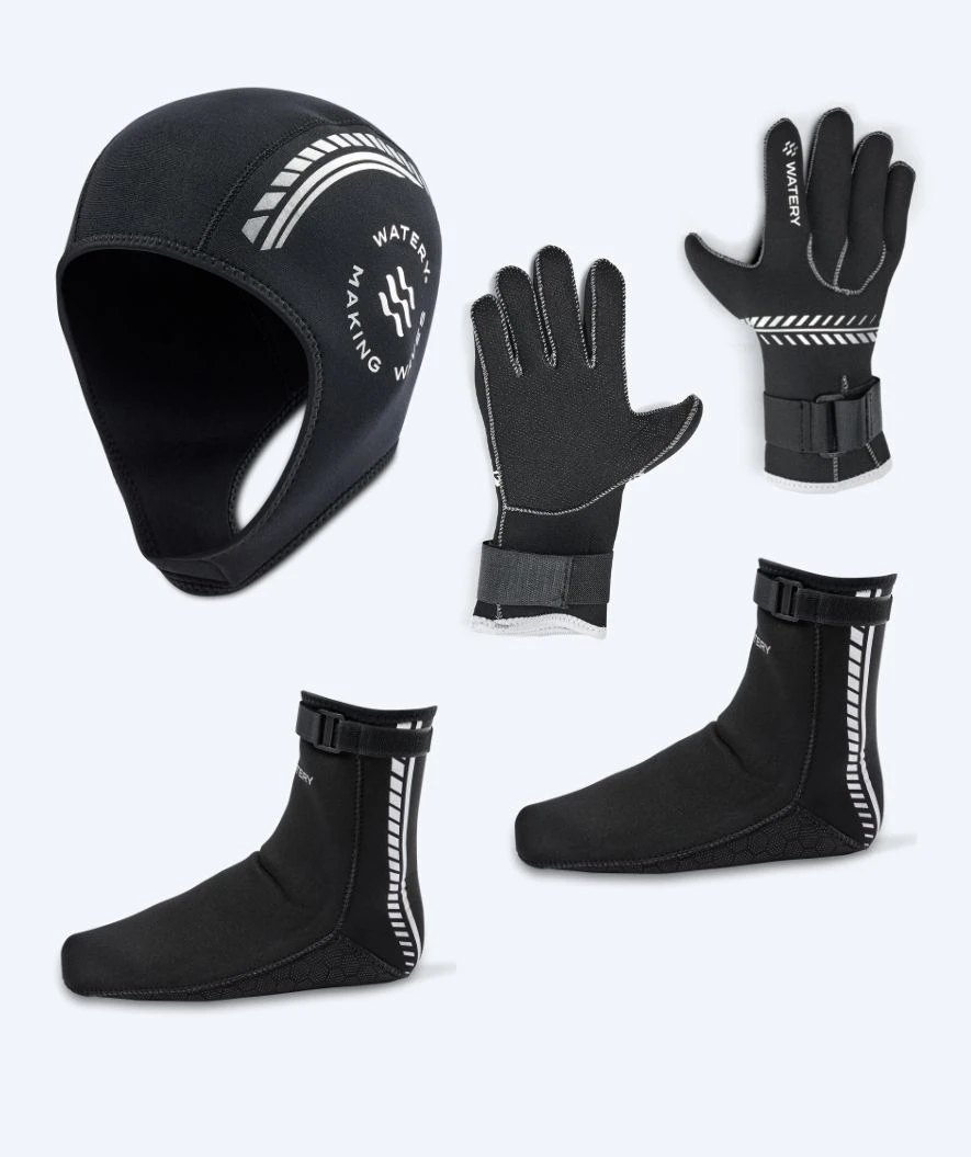 Thermal Reptile neoprensett kommer hovedsakelig i sort med refleksdetaljer i sølv, kombinert med en Watery-logo på hver enkelt del.