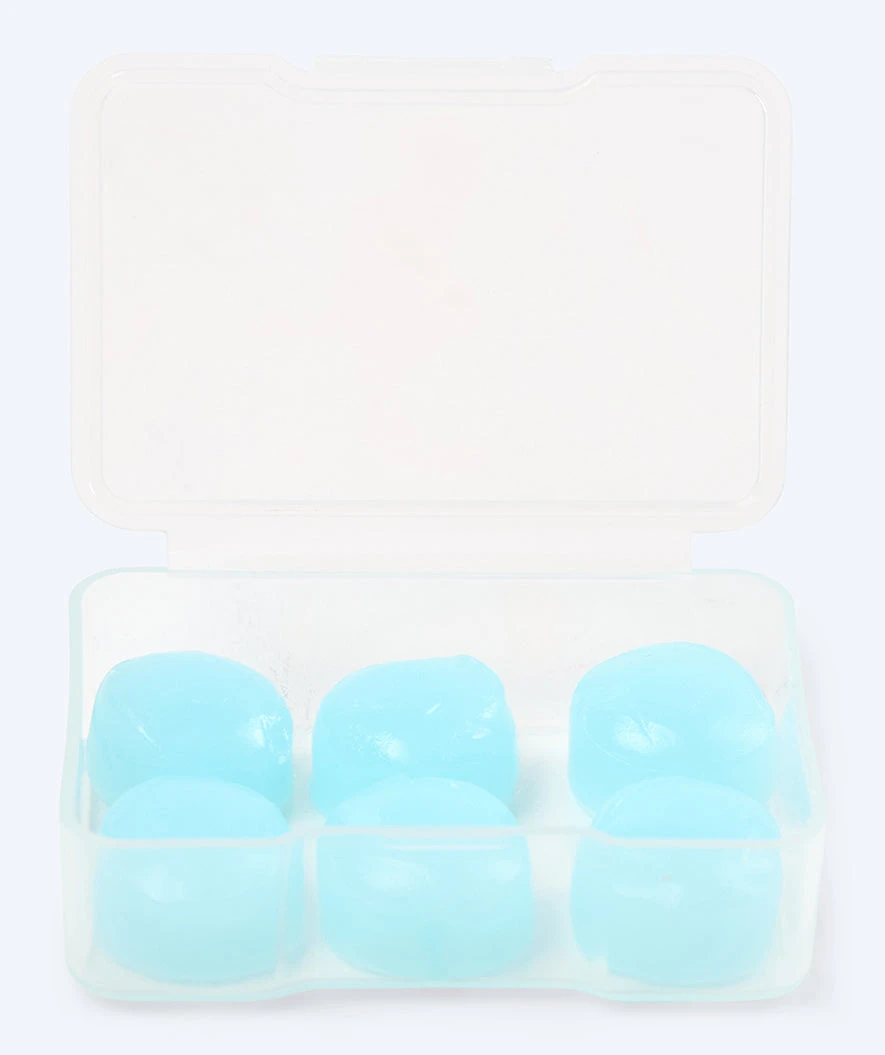 Formbare og vanntette ørepropper for voksne i blå silikon som enkelt kan moduleres etter ørenes konturer, som effektivt holder vann ute og beskytter mot svømmerens øre. Ekstremt behagelig å bruke over lengre tid, da de ikke sitter inne i selve øregangen og forårsaker irritasjon. Derfor egner de seg både til seriøs svømmetrening, vannsport eller bading på ferie.