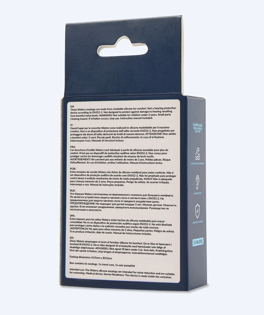 Ørepluggene kan i utgangspunktet gjenbrukes til overflaten ikke lenger blir klissete eller hvis de blir skitne. Avhengig av hvor godt du tar vare på dine Watery Indra øreplugger, kan de gjenbrukes opptil 12 ganger før det anbefales å bytte dem. Dette er imidlertid bare en tommelfingerregel, ettersom de etter lang tid i klor eller saltvann kan miste sin klebrighet, noe som gjør det vanskeligere å få dem fast i øret.