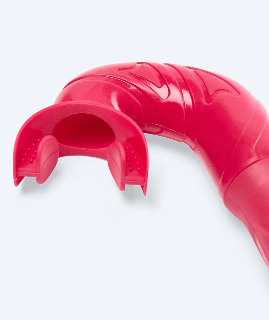 - Munnstykket er laget av høykvalitets silikon med et behagelig bitt særlig tilpasset barn mellom 9 og 16 år. Det kan til og med roteres mens det sitter på, slik at snorkelen hele tiden sitter korrekt. Man kan også ta munnstykket helt av og enten skifte det ut eller bare rengjøre det før det settes på igjen. Sammen sikrer dette at den samme snorkelen kan brukes i flere år – uten å måtte skiftes ut. Munnstykket er selvfølgelig matvaregodkjent.
