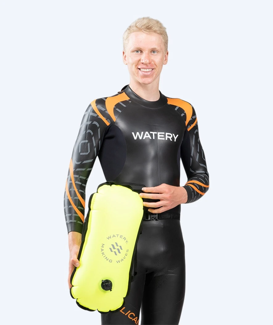 - Har en reflekterende Watery logo, som gjør deg mer synlig i åpent vann, særlig når solen er på vei ned.