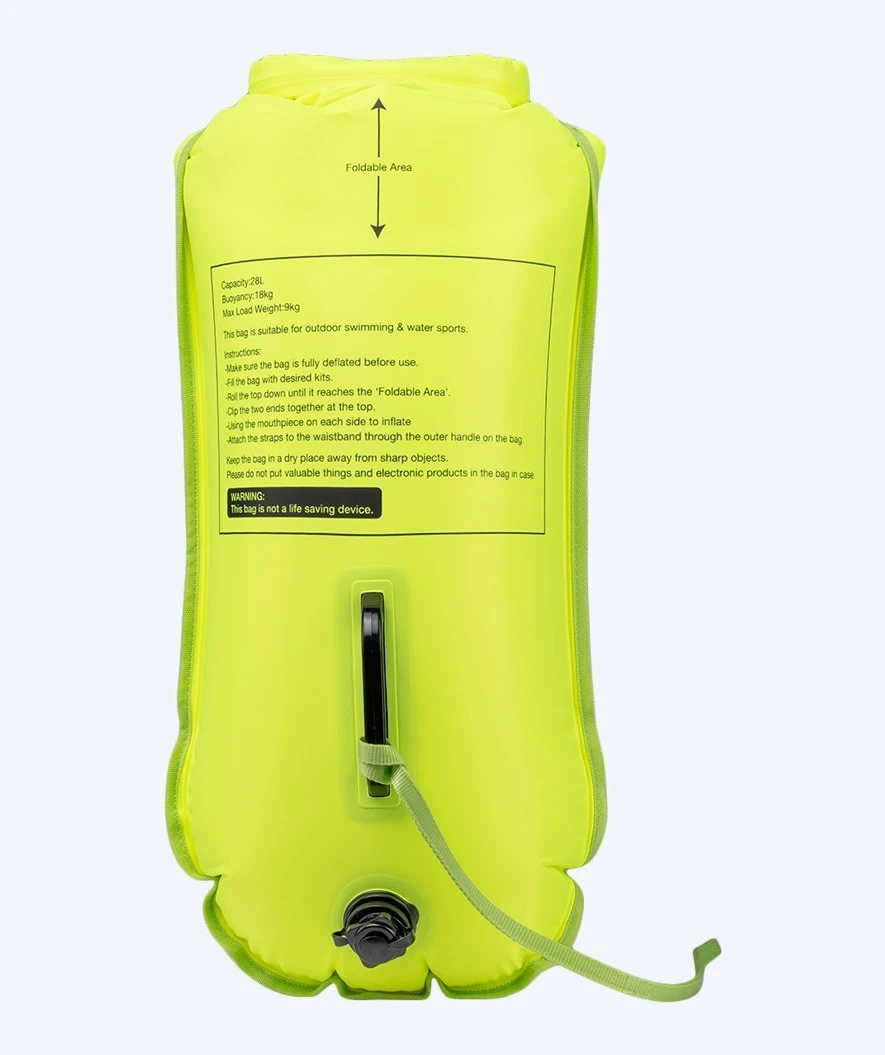 Watery Swim buoy & Dry bag i fargen fluo gulgrønn er med sin unike konstruksjon i nylon en mer slitesterk og motstandsdyktig Svømmebøye mot eventuelle hull i stoffet enn tilsvarende laget i PVC. Med denne svømmebøyen rundt midjen på svømmeturen i åpent vann, vises du bedre for vannfartøy, så vel som de på land. Du kan også pakke med deg eiendeler som mobiltelefon, håndkle, nøkler og klær i den vanntette posen, slik at du slipper å legge de igjen på stranden under svømmeturen.