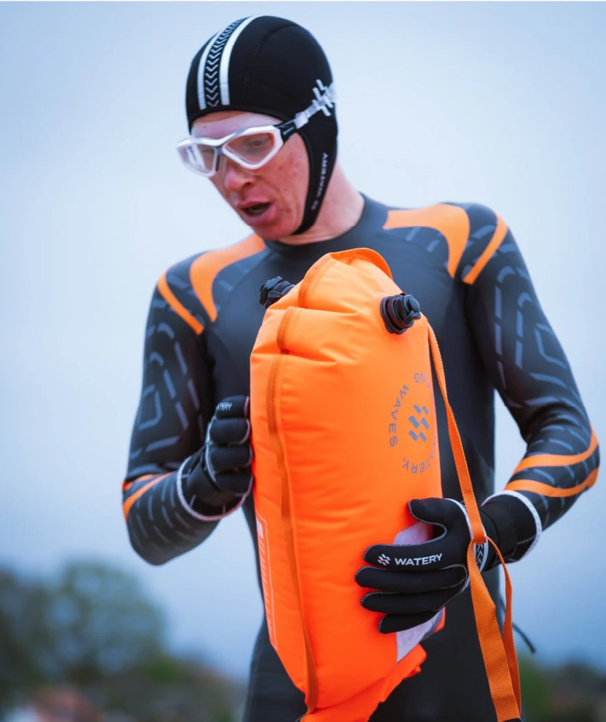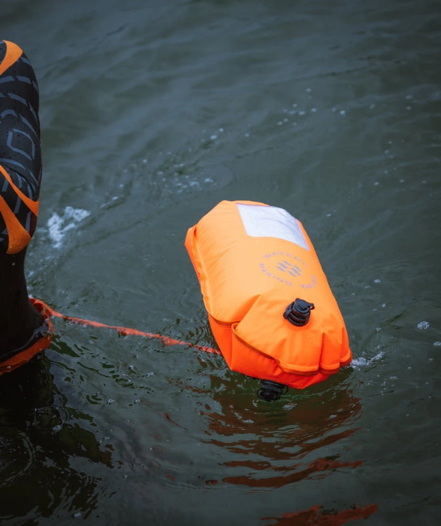 - Watery Swim Buoy & Dry Bag, her i klar oransje farge sørger for høy grad av synlighet for andre som også beveger seg i og på vannet, samt folk på land. Denne modellen er også tilgjengelig i flere andre flotte farger: Rosa, fluo gul og gul.