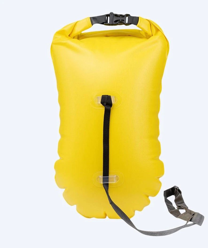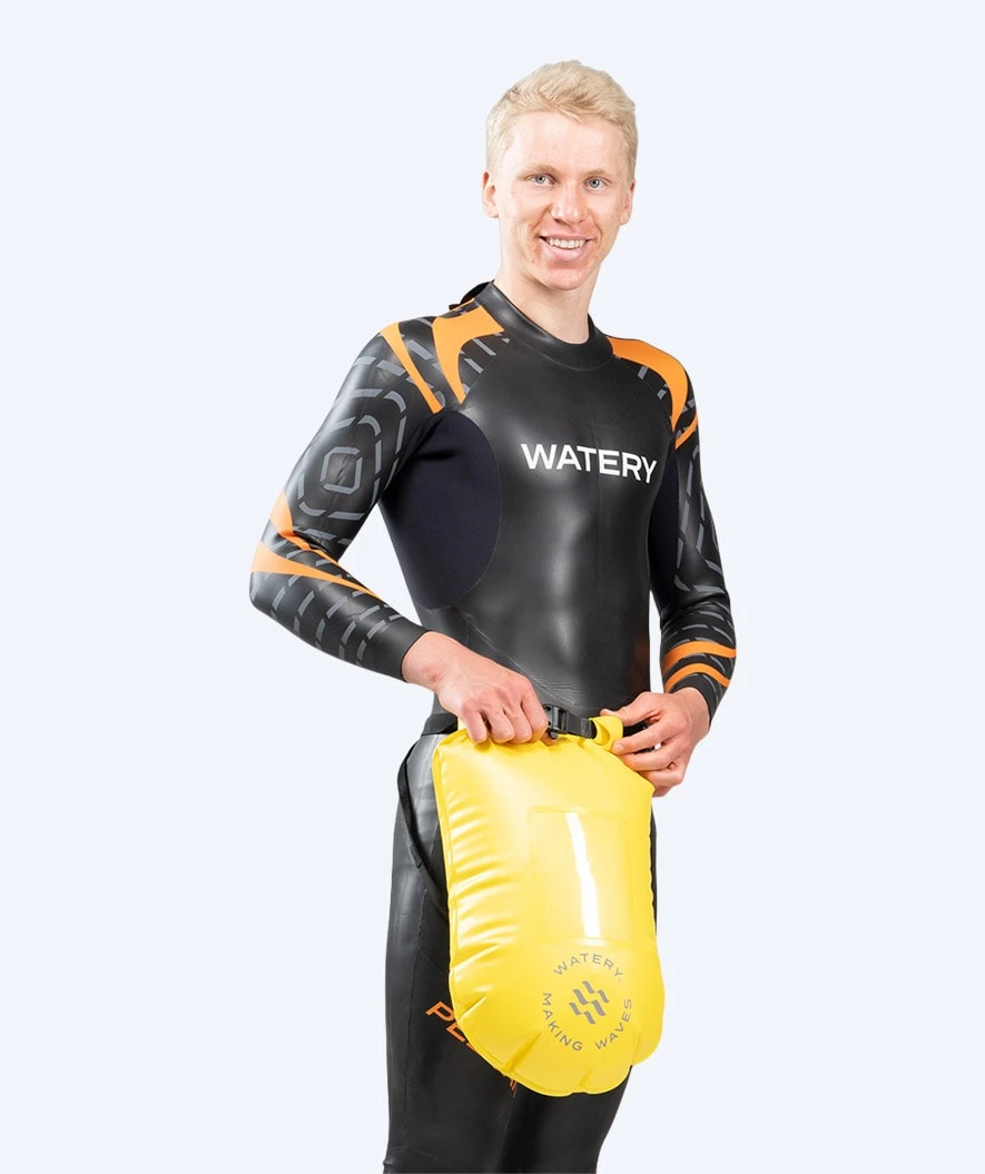 - Watery PVC Swim Buoy & Dry Bag, her i klar gul farge, sørger for høy grad av synlighet for andre som også beveger seg i og på vannet, samt folk på land. Denne modellen er også tilgjengelig i flere andre flotte farger: Rosa og oransje.