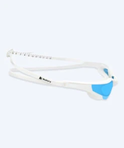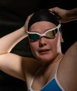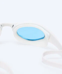 Denne Instinct Elite Mirror er hvit med sølv mirror, og den kan brukes både i svømmehallen og på stranden. Instinct Elite fås i fargene: sort, lilla, hvit, rosa, rød og blå. Instinct fås med gull mirror med rammer i fargene hvit, rosa og sort, samt med blå mirror med rammer i hvitt og sort.