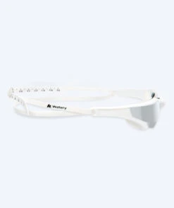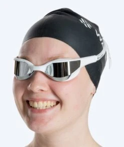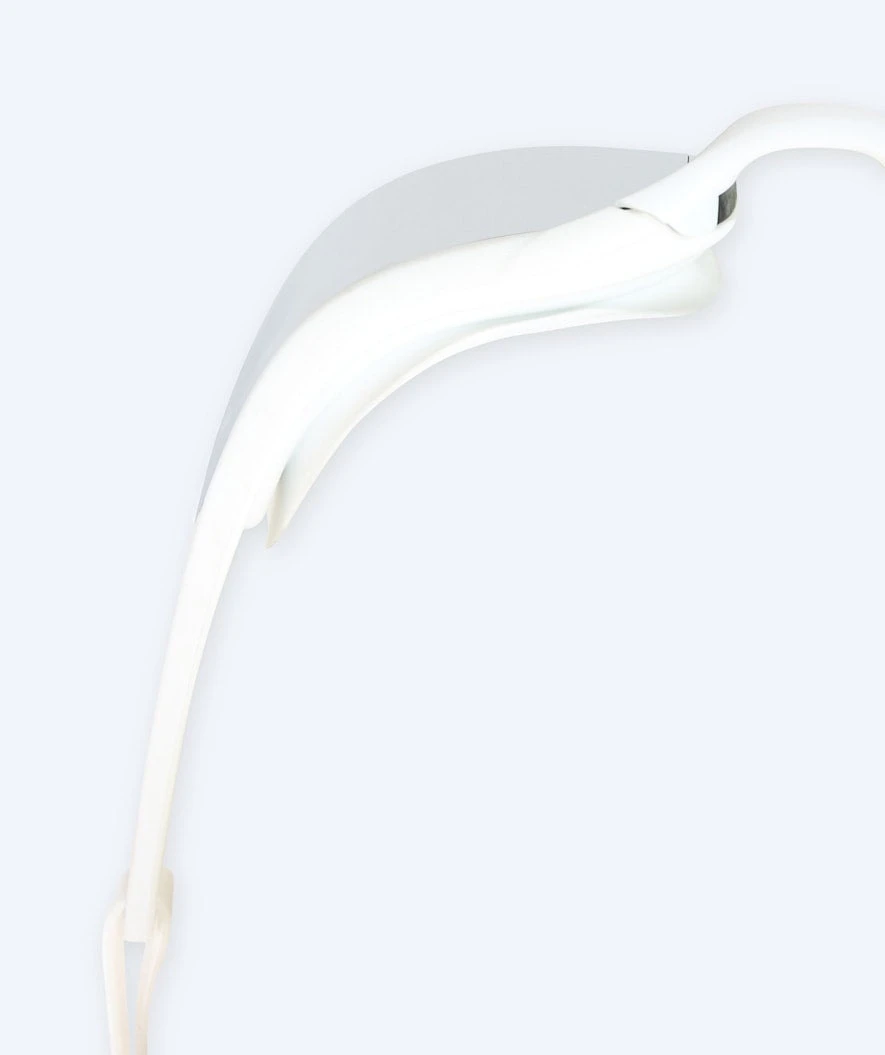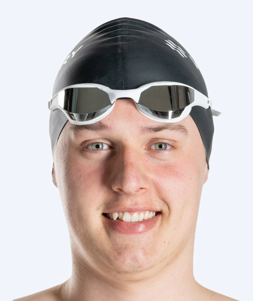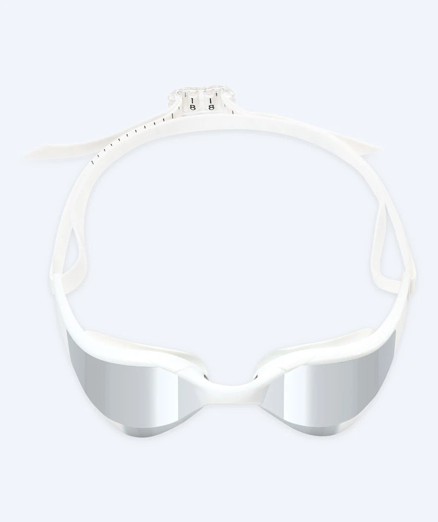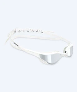 Denne Instinct Elite Mirror er hvit med sølv mirror, og den kan brukes både i svømmehallen og på stranden. Instinct Elite fås i fargene: sort, lilla, hvit, rosa, rød og blå. Instinct fås med gull mirror med rammer i fargene hvit, rosa og sort, samt med blå mirror med rammer i hvitt og sort.