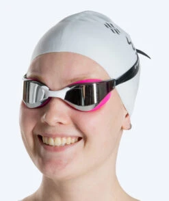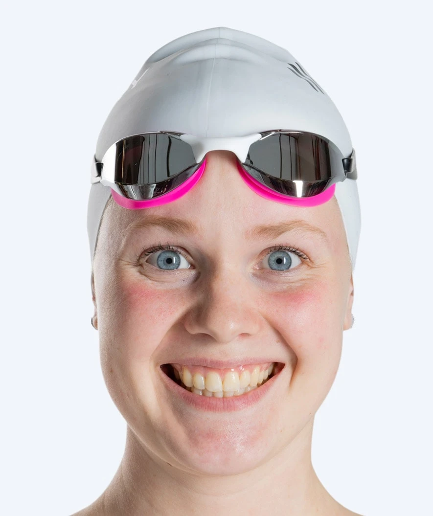 Denne Instinct Mirror er rosa med sølv mirror, og den kan brukes både i svømmehallen og på stranden. Instinct fås også med sølv mirror i fargene sort, hvit, lilla, rød og blå. Instinct fås med gull mirror og rammer i fargene hvit, rosa og sort, samt med blå mirror med rammer som er hvite og sorte.