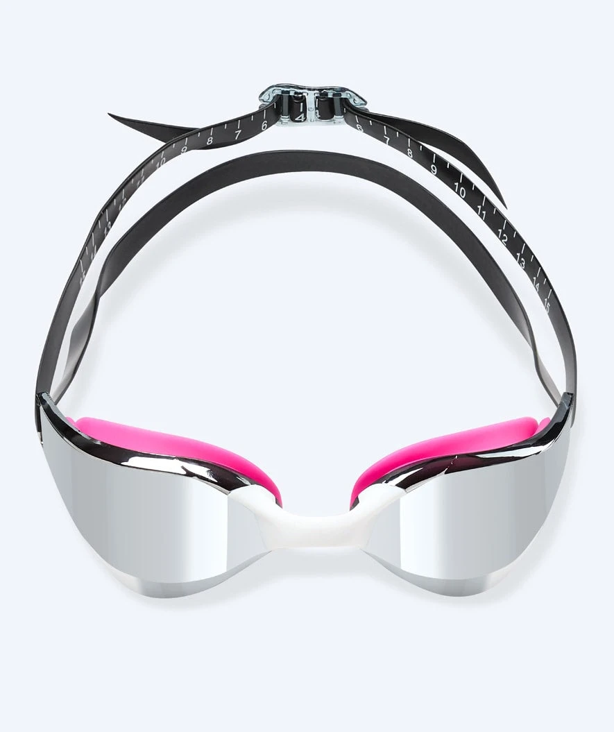 Stroppene på Instinct Mirror er todelt, så du kan plassere de en smule fra hverandre bak på hodet for å oppnå en fastere og sikrere passform, slik at de ikke faller av under stup eller tar inn vann. I tillegg er det tilføyd centimeter-markeringer på begge stroppene, så du alltid kan stille inn lengden til den som passer deg best. - 180 grader uhindret utsyn