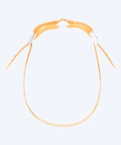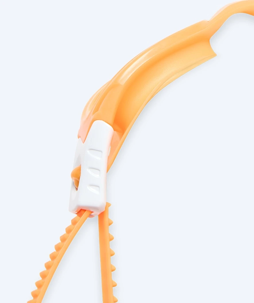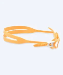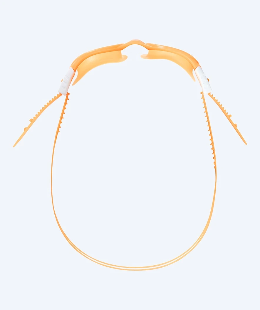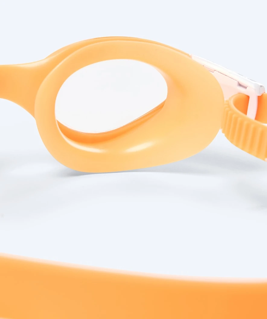 Svømmebrillen finnes i denne modellen i oransje med klare linser, men finnes også i fargene: Rosa/hvit, blå/hvit, rosa, grønn/hvit, lyseblå og lilla.