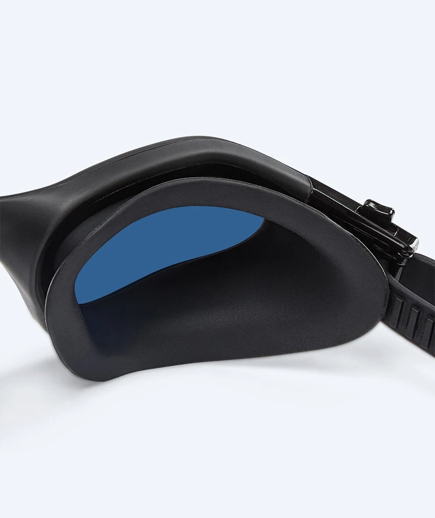 Raven Mirror er laget med buede high-definition linser som gir bredest mulig 180 graders sikt til begge sider slik at du alltid har full orientering under vann. I tillegg sørger high-definition linsene at du, til tross for det brede synsfeltet, fortsatt har skarp sikt helt ut til sidene, i motsetning til vanlige svømmebriller som kun gir deg skarphet i midten av linsen – altså når du ser rett frem i brillene. - Fleksibel og myk nesebro