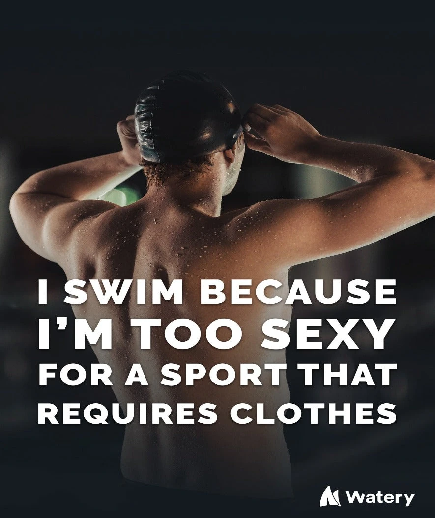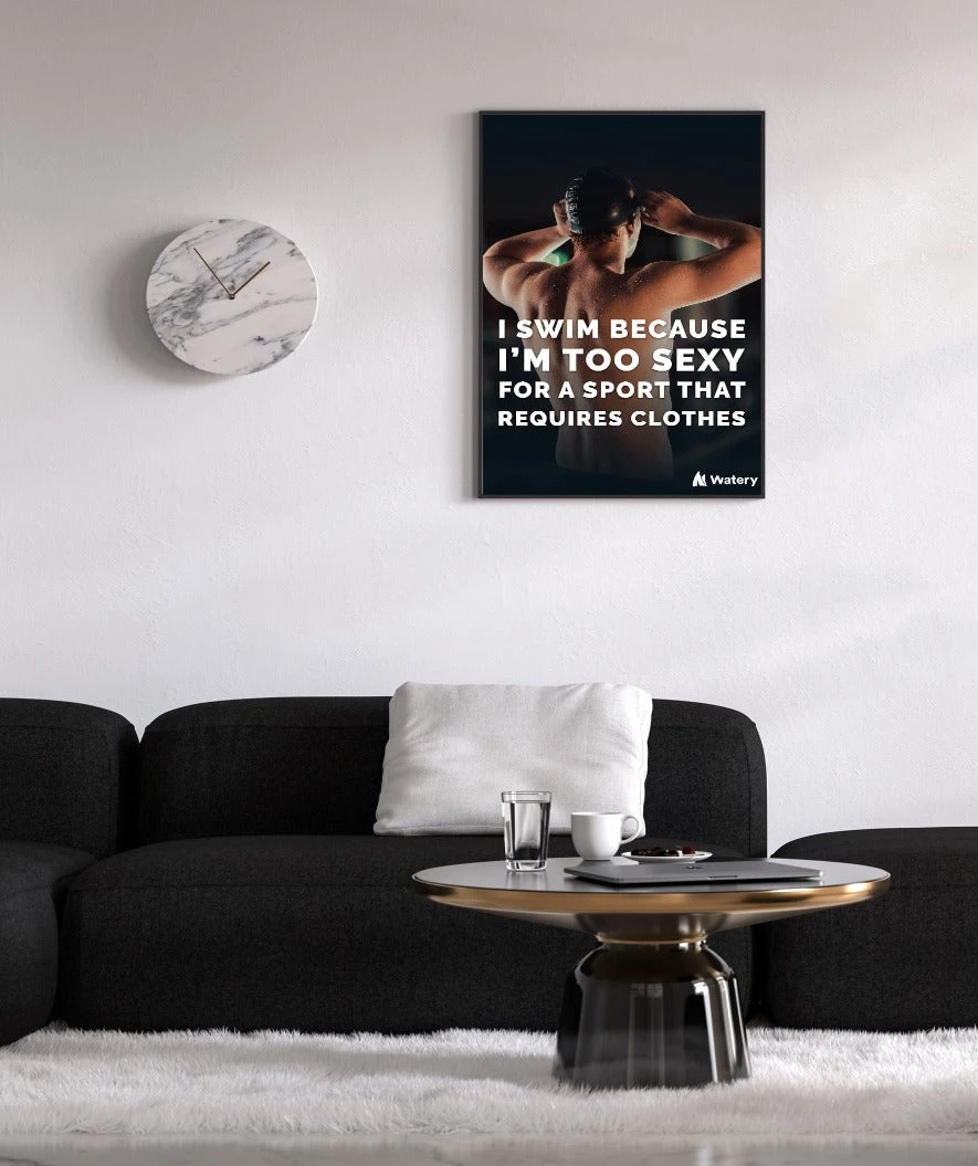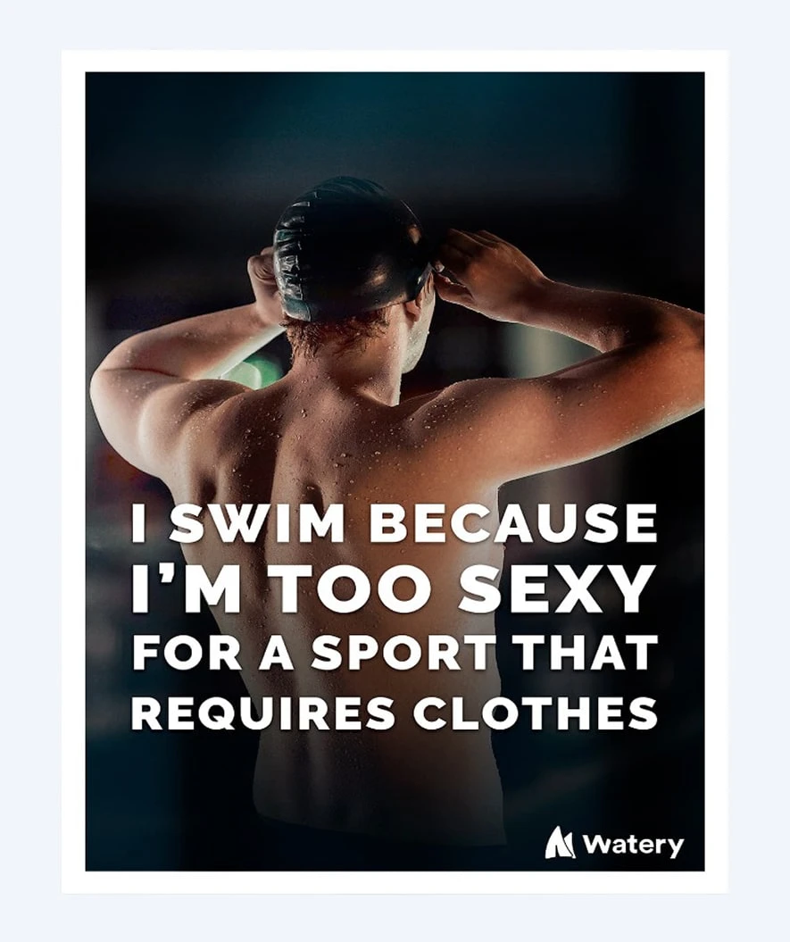 Ny kolleksjon: Denne plakaten med teksten «I swim because i´m too sexy for a sport that requires clothes» er laget i størrelsene A3 (30*42 cm) og B2 (50*70 cm) i en lekker kvalitet med UV-lakk på overflaten.