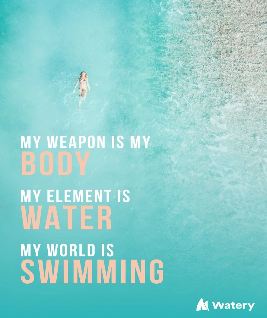 Ny kolleksjon: Denne plakaten med teksten «My weapon is my body – My element is Water – My world is Swimming» er laget i størrelsene A3 (30*42 cm) og B2 (50*70 cm) i en lekker kvalitet med UV-lakk på overflaten.