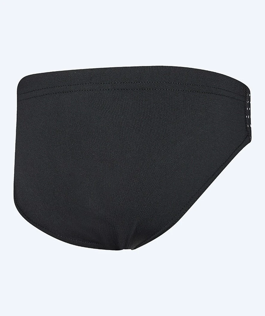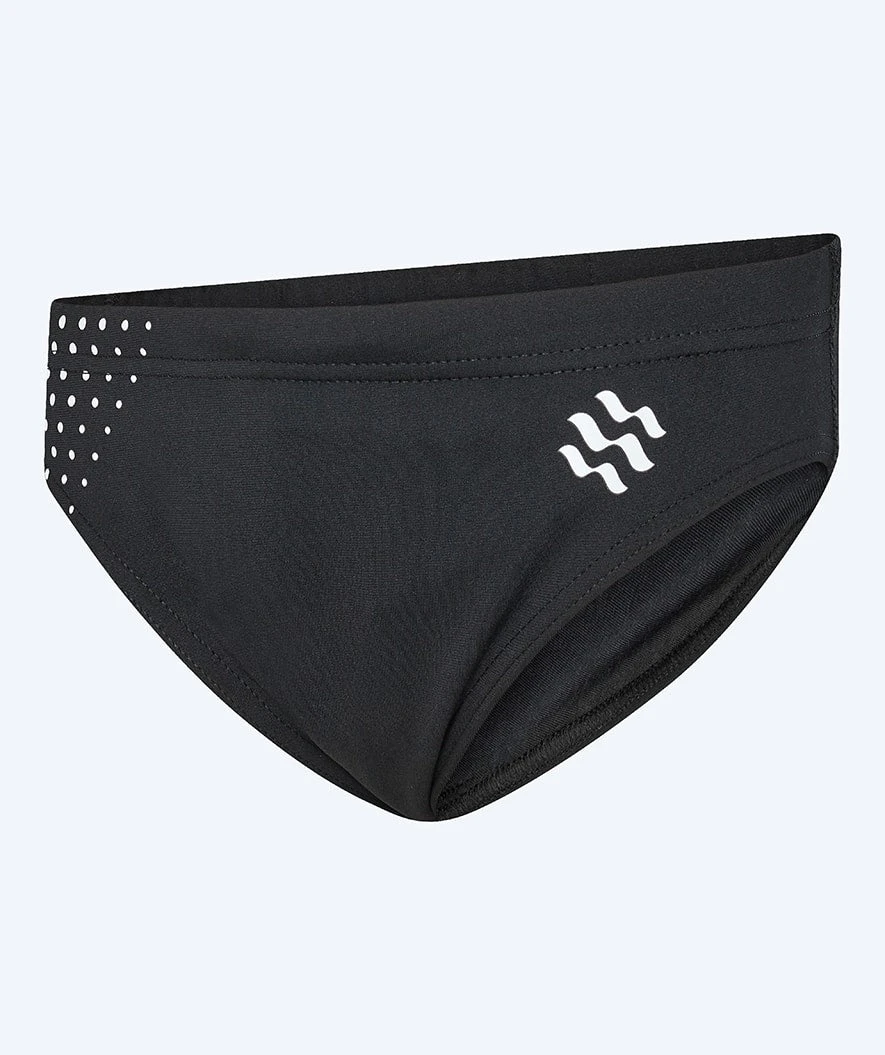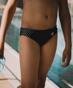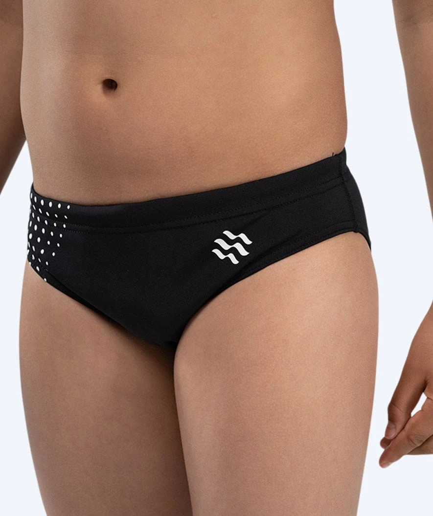 Trekantede badebukser, briefs, speedos. Kjært barn har mange navn, men ikke desto mindre har dette parret med Budgie Eco trekantede badebukser raskt blitt en av våre mest populære badebukser til gutter fra 3 til 15 år. Produsert i vårt unike signatur materiale AquaFlex Eco, som består av 100 % polyester (herav 55% fra resirkulerte plastflasker), så får du det eneste tilgjengelige parret med briefs i bærekraftige materialer, som samtidig er ultra klorresistente. Designet er holdt enkelt og stilfullt med en lengde på siden på 5,5 cm, her i den populære fargen Black Sporty.