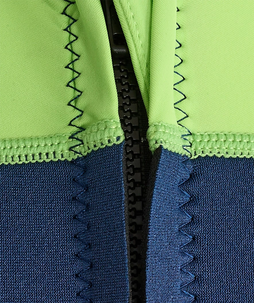 - Våtdrakten er laget i 2 mm neopren på bena og kroppen, slik at barnet ditt holdes varmt og er 100 % beskyttet mot solens stråler. Samtidig gir det god oppdrift for barnet. De mørke fargene her er også bevisst valgt her for å gi ekstra varme.