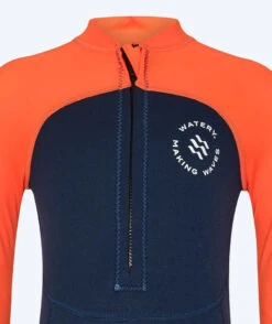 - Våtdrakten er konstruert i 2 mm neoprene i beina og kroppen, så barnet ditt holdes varmt og blir 100 % beskyttet mot solens stråler. Samtidig gir det god oppdrift for barnet. De mørke fargene er er valgt her for å gi ytterligere varme.