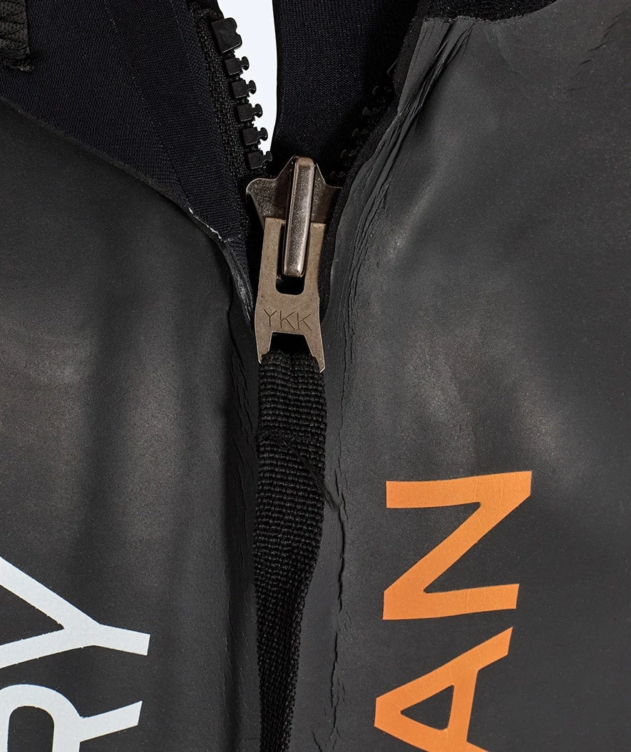 Bakpå er Pelican laget tradisjonelt for den raskest mulige av- og påtagning, hvor den meget holdbare YKK-glidelåsen i rustfritt stål trekkes opp fra bunnen med den påsatte nylon-snoren for at lukke den. Du kan derfor enkelt ta av og på våtdrakten, uten behov for hjelp. I tillegg er bein-utskjæringene ved anklene laget anatomisk i super-stretch neoprene, så våtdrakten enkelt kan trekkes helt av. For å unngå at nylon-snoren forstyrrer under selve svømmingen kan den festes nede ved starten av glidelåsen med borrelås.